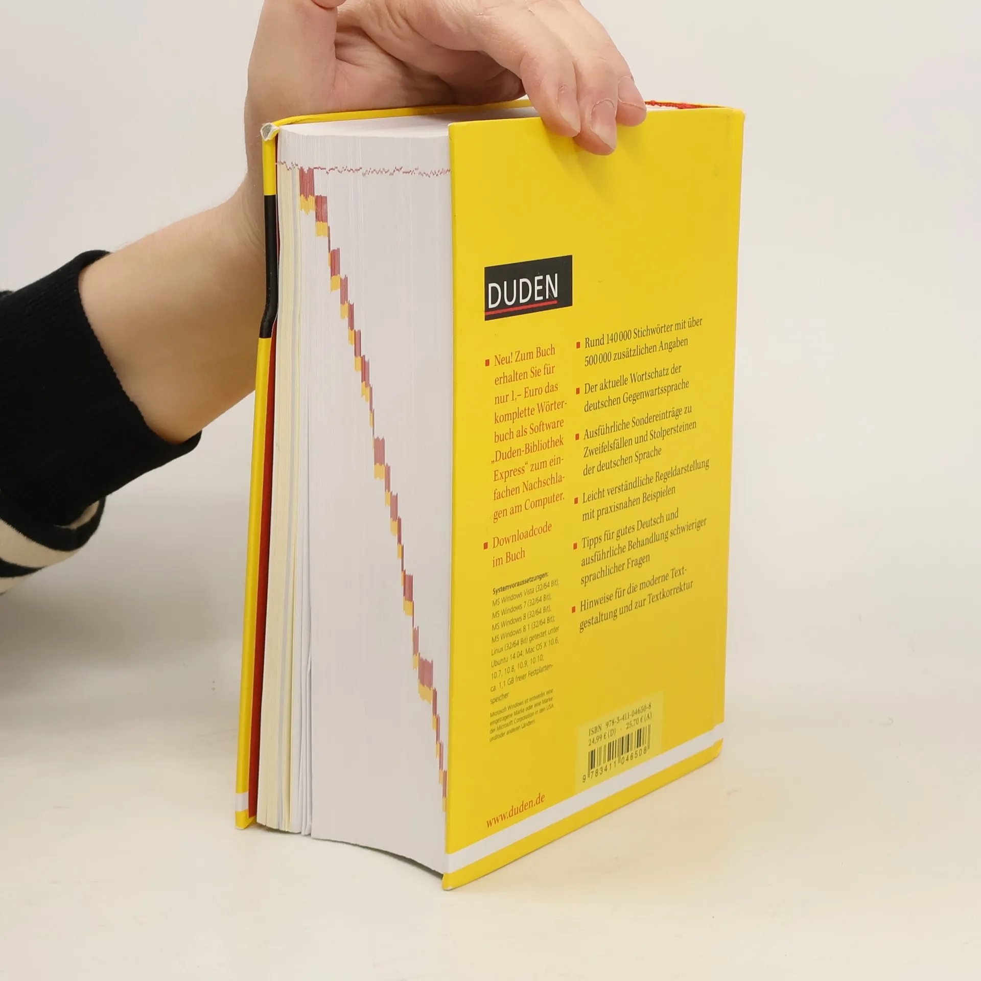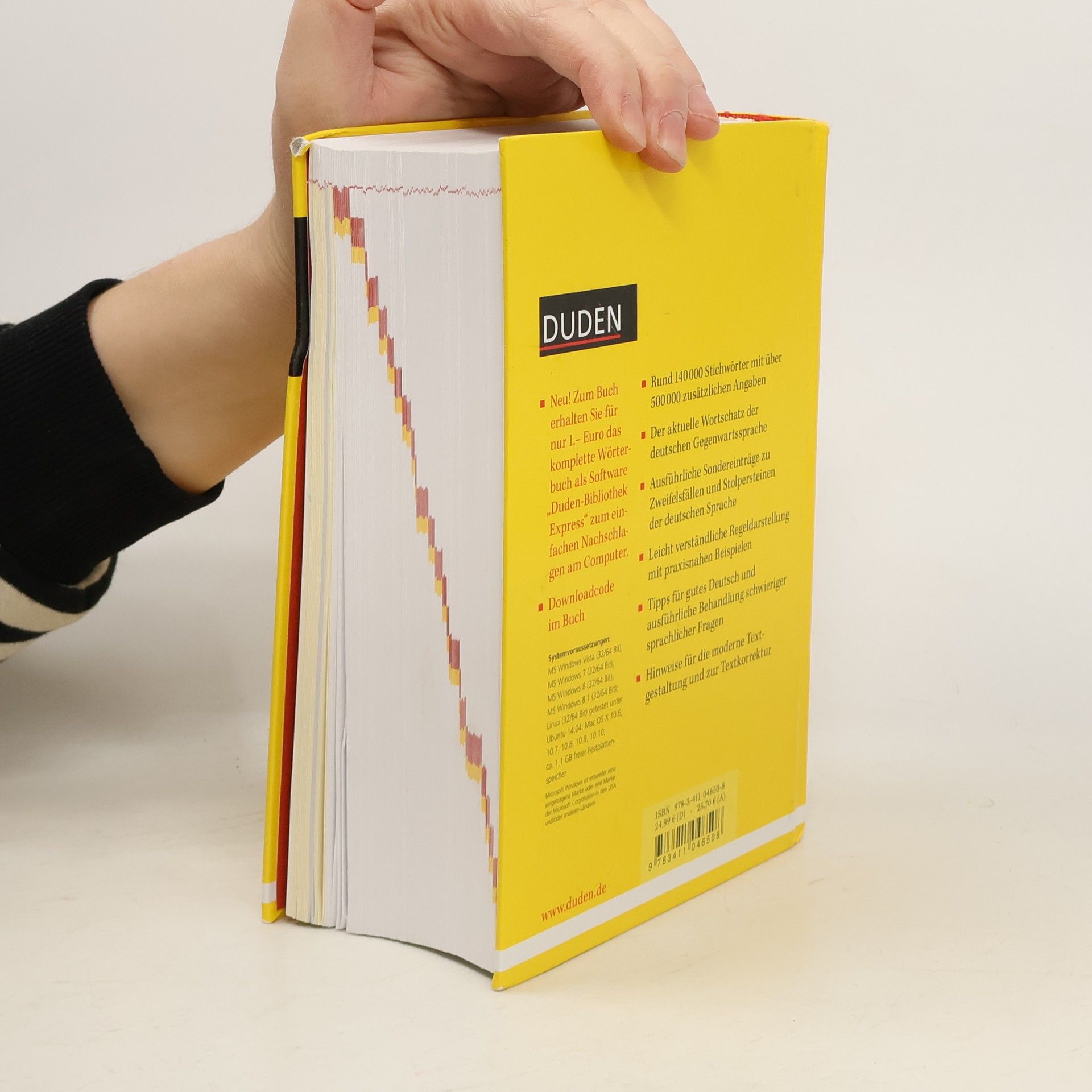 Mit seinen 5.000 neuen Wörtern bietet der "Duden - Die deutsche Rechtschreibung" nun 140.000 Stichwörter mit über 500.000 Bedeutungserklärungen und zusätzlichen Angaben zu Worttrennung, Aussprache, Grammatik, Etymologie und Stil. Die Regeln sind leicht verständlich dargestellt und mit praxisnahen Beispielen versehen. Darüber hinaus finden sich ausführliche Sondereinträge zu Zweifelsfällen und Stolperfallen der deutschen Sprache, Tipps für gutes Deutsch sowie Hinweise zur modernen Textgestaltung. Neu: Buchkäufer erhalten den kompletten Wörterbuchinhalt zum Buch auch als Programm "Duden-Bibliothek Express" für das einfache Nachschlagen am Computer für nur 1,- Euro (Downloadcode im Buch). Zahlreiche Suchfunktionen erleichtern die Recherche direkt beim Schreiben. Die Software ist kombinierbar mit allen anderen elektronischen Wörterbüchern aus der Software-Reihe "Duden-Bibliothek". Systemvoraussetzungen: MS Windows Vista (32/64 Bit), MS Windows 7 (32/64 Bit), MS Windows 8 (32/64 Bit), MS Windows 8.1 (32/64 Bit); Linux (32/64 Bit) getestet unter Ubuntu 14.04; Mac OS X 10.6, 10.7, 10.8, 10.9, 10.10; ca. 1,1 GB freier Festplattenspeicher.