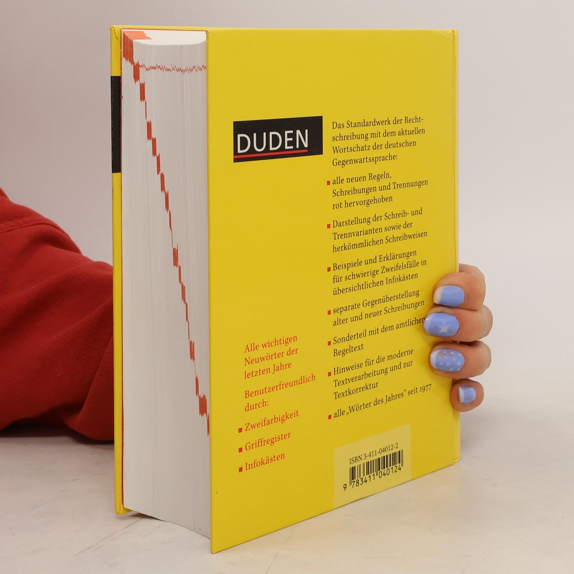 Ganz im sommerlich gelben Outfit präsentiert sich der aktuelle Duden zur neuen Rechtschreibung. In dieser 22., völlig neu bearbeiteten Auflage sind alle neuen Rechtschreibregeln verbindlich zusammengefasst. Zudem haben es 5.000 neue Wörter geschafft, Einzug in das Standardwerk zu halten -- von "aufbrezeln" über "Bimbes" und "Maschendrahtzaun" bis hin zum "Warmduscher". Der Duden 2000 verzeichnet alle neuen und alle herkömmlichen Schreib- und Trennweisen eines Wortes und informiert somit umfassend über den heutigen Stand der deutschen Rechtschreibung. Um das Nachschlagen und damit den Umstieg auf die neuen Regeln zu erleichtern, wurde das gesamte Lay-out des Innenteils verbessert. Allen voran bieten die 300 farbig hervorgehobenen Infokästen zu Stichwörtern, deren Schreibung und korrekter Gebrauch besondere Schwierigkeiten bereiten, eine gute Übersicht. Informativ und gut verständlich ist auch der einleitende Teil "Rechtschreibung und Zeichensetzung". Die Regeln sind nach Themen wie Apostroph oder Bindestrich geordnet und farbig unterlegt. Ausführliche Beispiele zu den einzelnen Regeln helfen dabei, Unsicherheiten zu beseitigen. Somit ist der Duden 2000 mit seinen insgesamt 120.000 Stichwörtern und den über 500.000 Beispielen ein sehr vielseitiges deutsches Wörterbuch, das alle Fragen der sprachlichen Alltagspraxis beantwortet. --Bettina Wenzel und Herwig Slezak