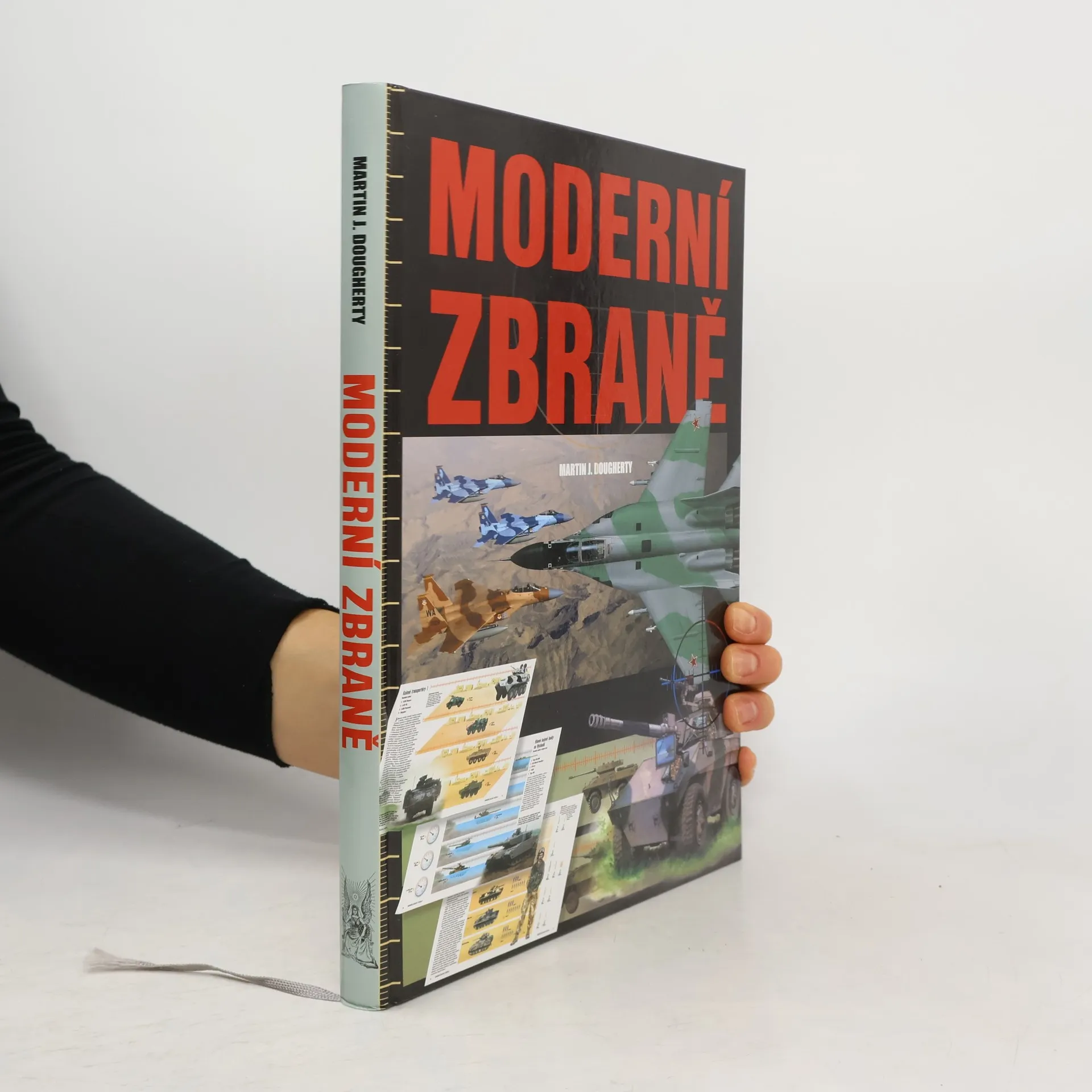 Martin J. Dougherty je úspěšným autorem mnoha knih s válečnou tematikou a věnuje se též bojovým uměním či šermu. Kniha Moderní zbraně obsahuje přes 300 různých zbraňových systémů, které jsou přehledně rozděleny do pěti skupin: vzdušné síly; obrněná bojová vozidla; dělostřelectvo, bomby a řízené střely; námořní síly a ruční zbraně. Na jednotlivých dvoustranách jsou pozoruhodným způsobem srovnávány podobné typy zbraní používané v moderním válečnictví. Kritéria pro posuzování jednotlivých zbraňových systémů se pochopitelně značně liší, neboť každá zbraň disponuje různými vlastnostmi potřebnými pro plnohodnotné plnění úkolů. Barevné diagramy slouží k porovnání různých klíčových vlastností (například maximální rychlosti, doletu, stoupavosti, dostřelu, výtlaku, ráže zbraní či kapacity zásobníků). Kniha obsahuje rovněž kresby srovnávaných zbraní a zajímavé fotografie.