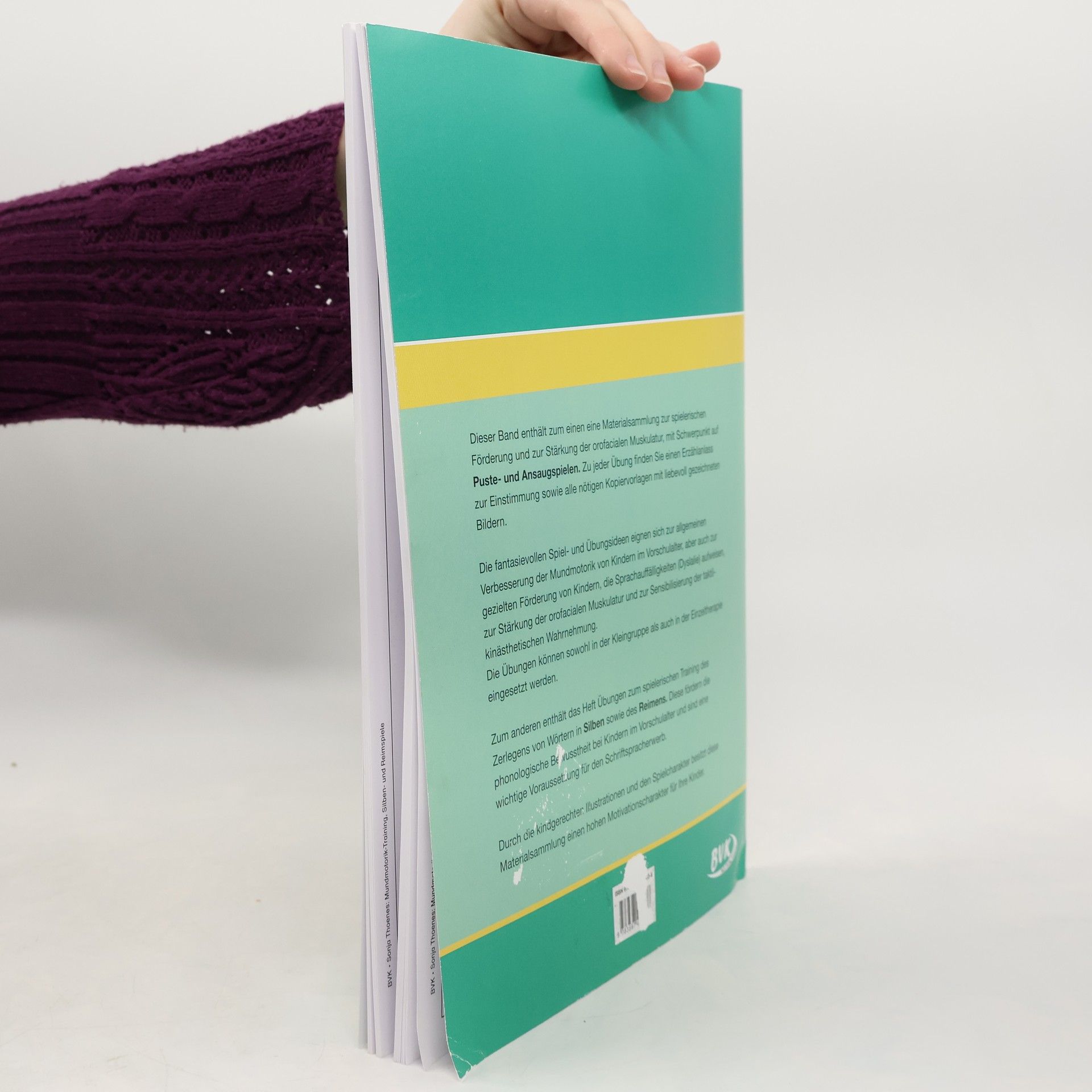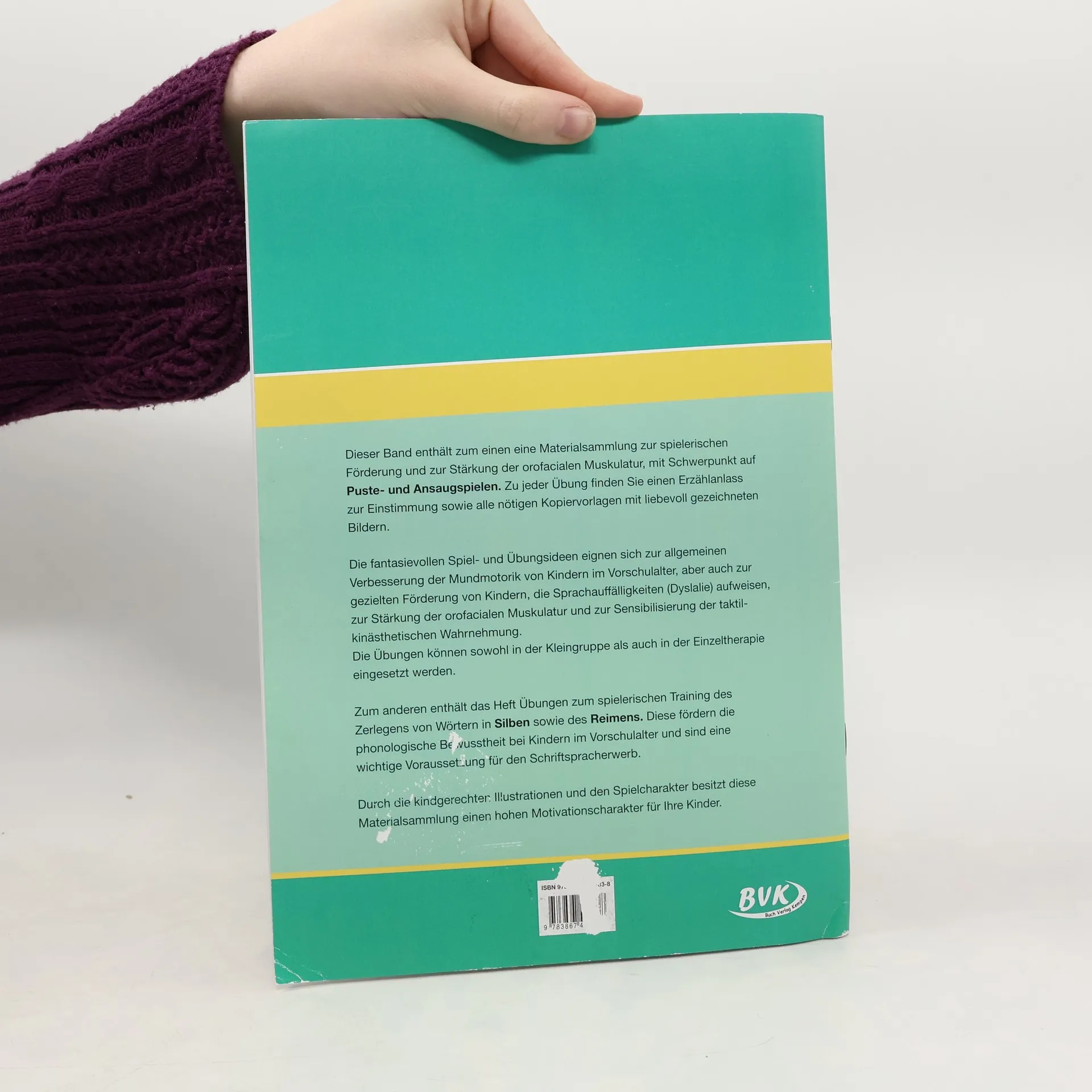 Mundmotorik, Silben und Reime leicht gemacht! Der zweite Band enthält eine ergänzende Materialsammlung zur spielerischen Förderung und zur Stärkung der orofacialen Muskulatur, mit Schwerpunkt auf Pustespielen und Ansaugspielen. Zu jeder Übung finden Sie einen Erzählanlass zur Einstimmung auf die Übung sowie alle nötigen Kopiervorlagen mit liebevoll gezeichneten Bildern. Die fantasievollen Spielideen und Übungsideen eignen sich zur allgemeinen Verbesserung der Mundmotorik von Kindern im Vorschulalter, aber auch zur gezielten Förderung von Kindern, die Sprachauffälligkeiten (Dyslalie) aufweisen, zur Stärkung der orofacialen Muskulatur und zur Sensibilisierung der taktil-kinästhetischen Wahrnehmung. Die Übungen können sowohl in der Kleingruppe als auch in der Einzeltherapie eingesetzt werden. Außerdem enthält das Heft Übungen zum spielerischen Training des Zerlegens von Wörtern in Silben sowie des Reimens. Diese fördern die phonologische Bewusstheit bei Kindern im Vorschulalter und sind eine wichtige Voraussetzung für den Schriftspracherwerb. Kindgerechte Illustrationen motivieren die Kinder nachhaltig für die Übungen!