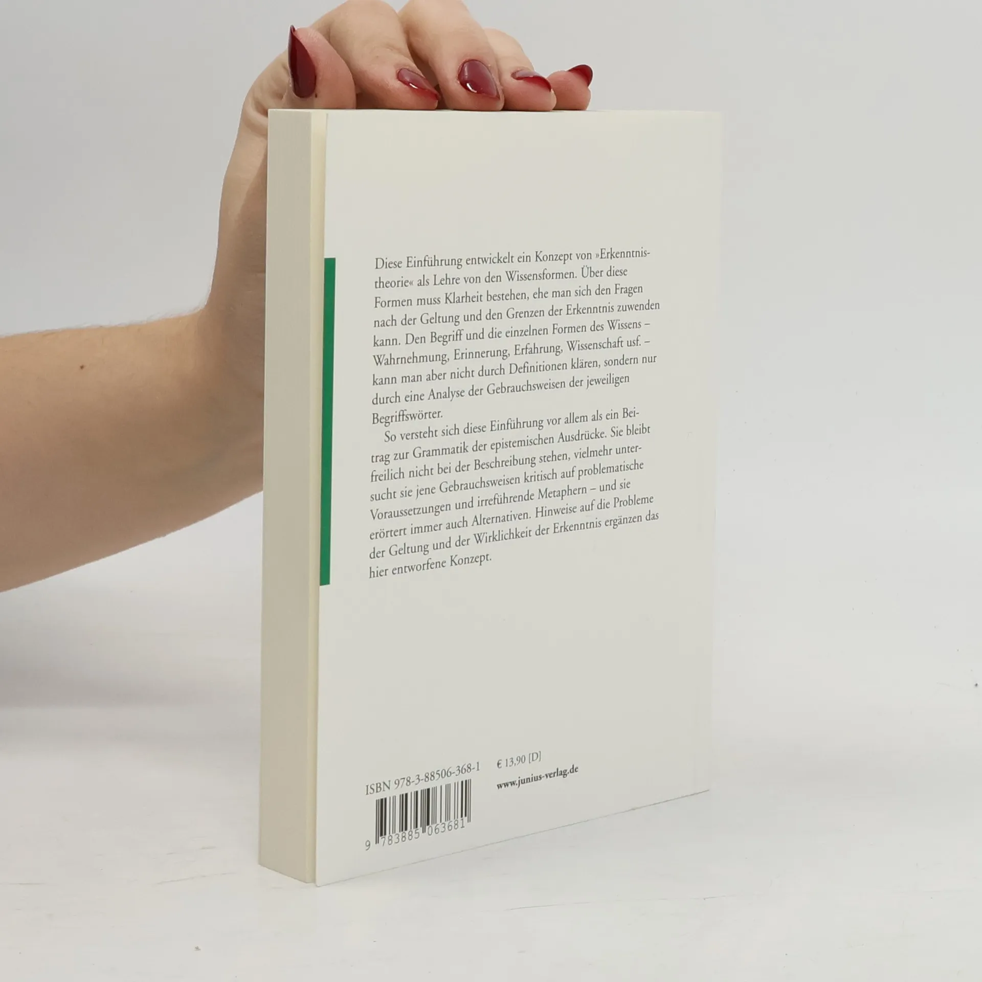 Diese Einführung entwickelt ein Konzept von 'Erkenntnistheorie' als Lehre von den Wissensformen. Über diese Formen muss Klarheit bestehen, ehe man sich den Fragen nach der Geltung und den Grenzen der Erkenntnis zuwenden kann. Den Begriff und die einzelnen Formen des Wissens – Wahrnehmung, Erinnerung, Erfahrung, Wissenschaft usf. – kann man aber nicht durch Definitionen klären, sondern nur durch eine Analyse der Gebrauchsweisen der jeweiligen Begriffswörter. So versteht sich diese Einführung vor allem als ein Beitrag zur Grammatik der epistemischen Ausdrücke. Sie bleibt freilich nicht bei der Beschreibung stehen, vielmehr untersucht sie jene Gebrauchsweisen kritisch auf problematische Voraussetzungen und irreführende Metaphern - und sie erörtert immer auch Alternativen. Hinweise auf die Probleme der Geltung und der Wirklichkeit der Erkenntnis ergänzen das hier entworfene Konzept.