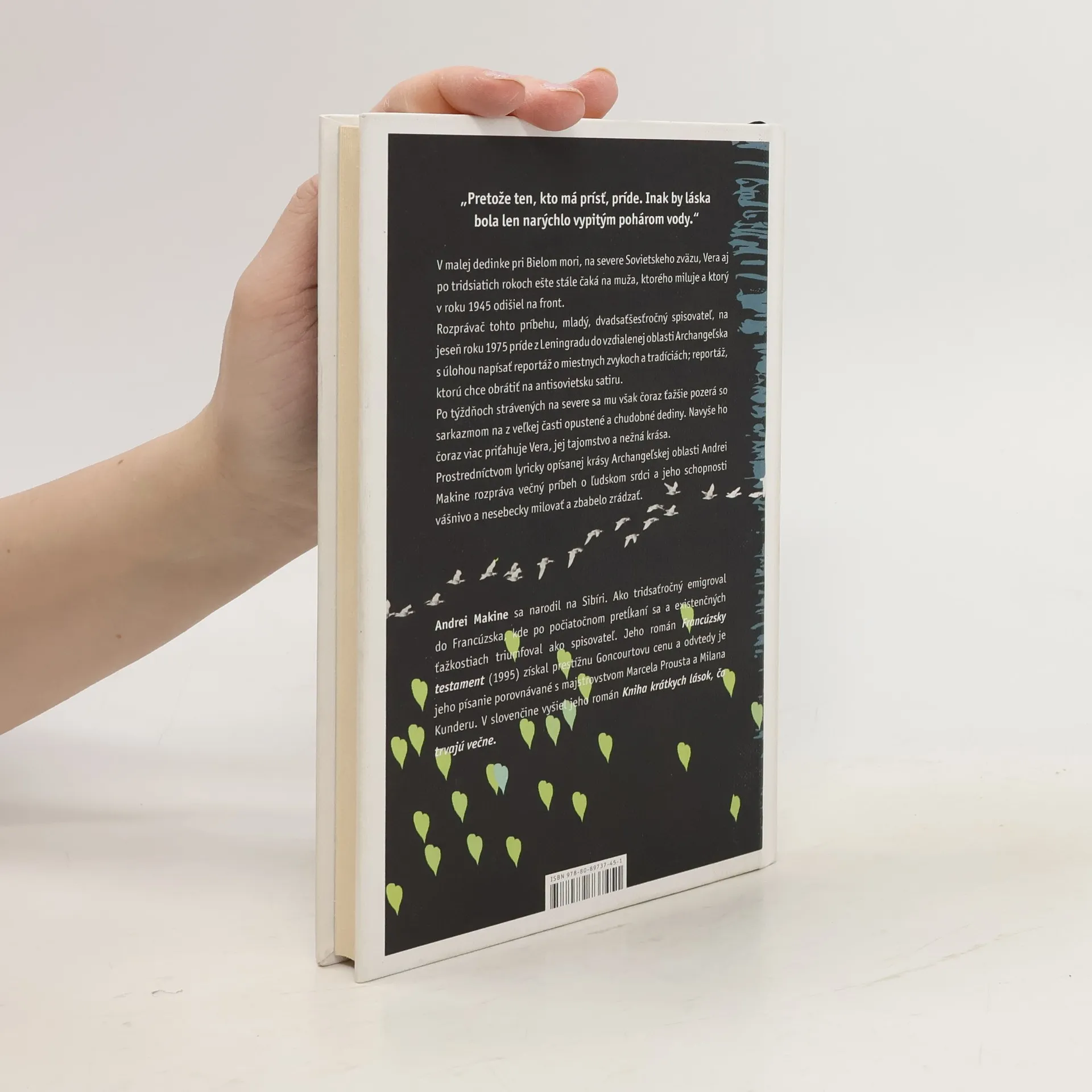 „Pretože ten, kto má prísť, príde. Inak by láska bola len narýchlo vypitým pohárom vody.“ V malej dedinke pri Bielom mori, na severe Sovietskeho zväzu, Vera aj po tridsiatich rokoch ešte stále čaká na muža, ktorého miluje a ktorý v roku 1945 odišiel na front. Rozprávač tohto príbehu, mladý, dvadsaťšesťročný spisovateľ, na jeseň roku 1975 príde z Leningradu do vzdialenej oblasti Archangeľska s úlohou napísať reportáž o miestnych zvykoch a tradíciách; reportáž, ktorú chce obrátiť na antisovietsku satiru. Po týždňoch strávených na severe sa mu však čoraz ťažšie pozerá so sarkazmom na z veľkej časti opustené a chudobné dediny. Navyše ho čoraz viac priťahuje Vera, jej tajomstvo a nežná krása. Prostredníctvom lyricky opísanej krásy Archangeľskej oblasti Andrei Makine rozpráva večný príbeh o ľudskom srdci a jeho schopnosti vášnivo a nesebecky milovať a zbabelo zrádzať.