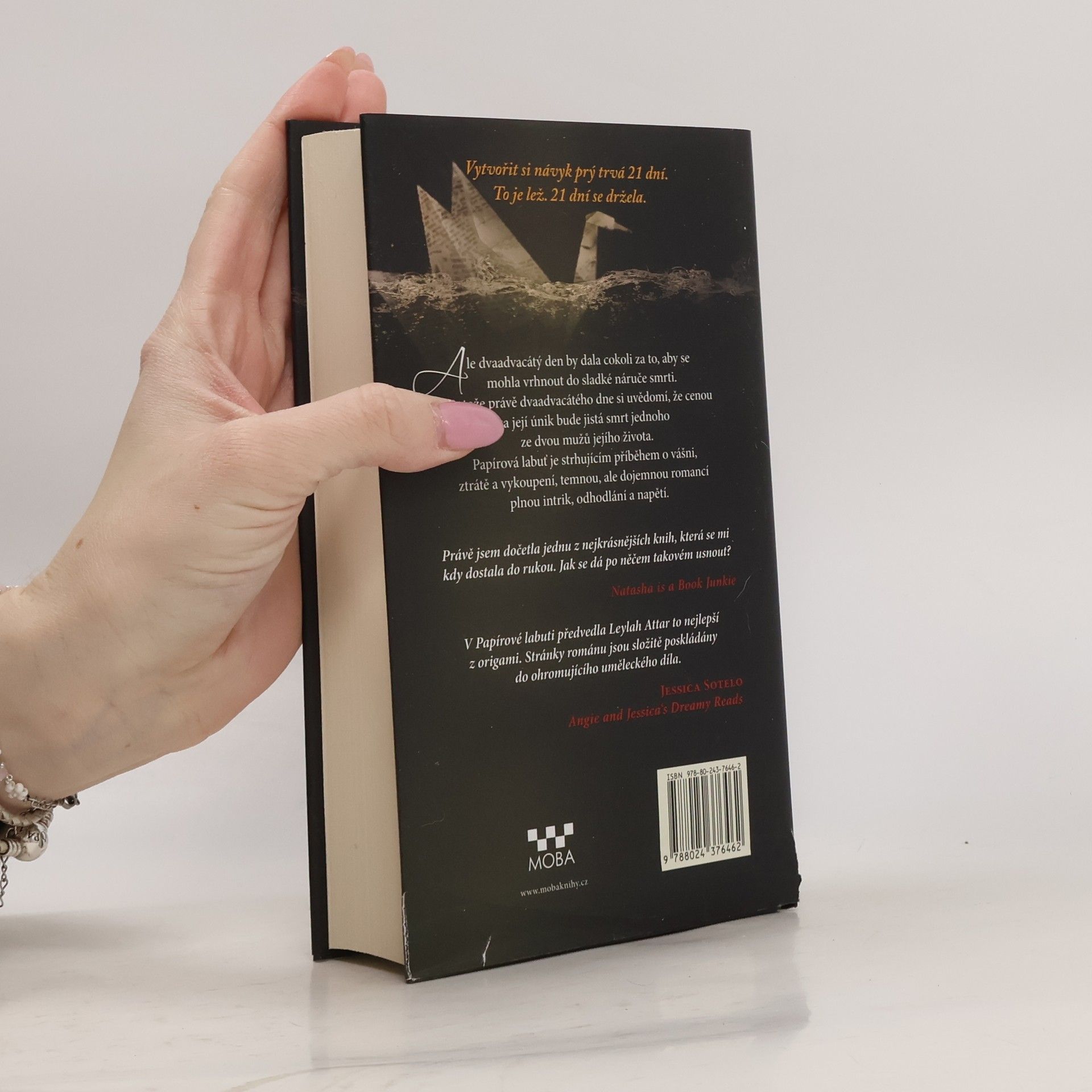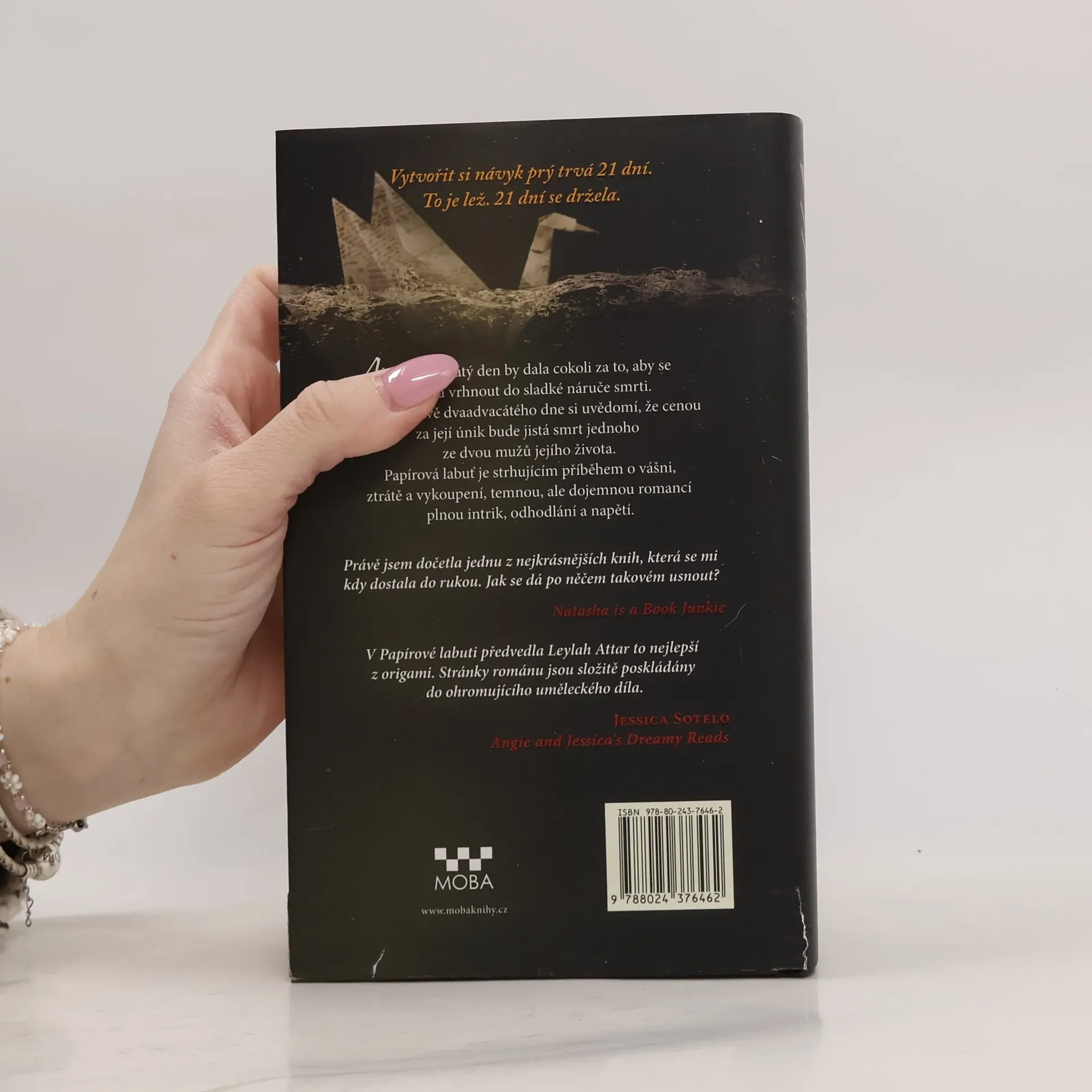 Vytvoření návyku prý trvá 21 dní. Je to lež. 21 jedna dní se držela. Ale ve dvaadvacátý den by dala cokoli, aby se mohla vrhnout do sladké náruči smrti. Protože dvaadvacátý den si uvědomí, že cenou za její únik bude jistá smrt jednoho ze dvou mužů, které miluje. Papírová labuť je strhujícím příběhem o vášni, ztrátě a vykoupení, temnou, avšak dojemnou romancí plnou intrik, kuráže a napětí. Vzhledem k násilnému obsahu, sexu a vulgarismům je román určen vyzrálým čtenářům. Téma není pro slabší povahy.