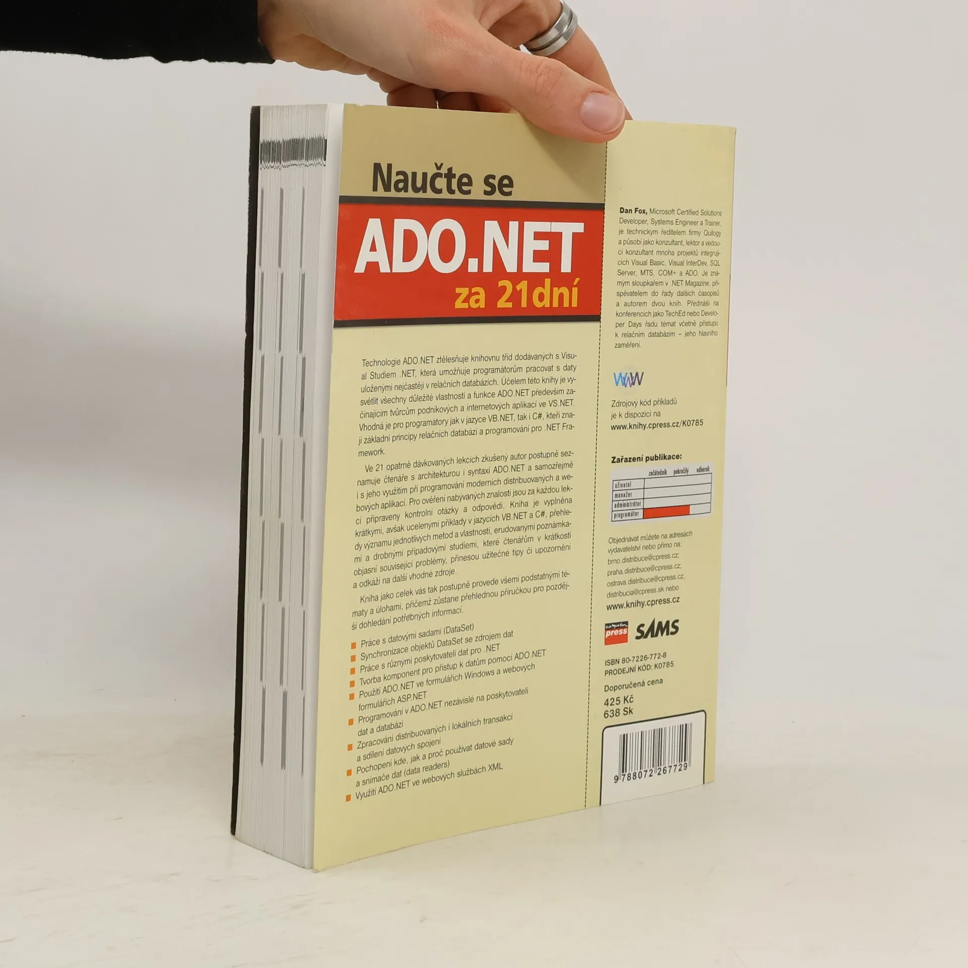 Technologie ADO.NET ztělesňuje knihovnu tříd dodávaných s Visual Studiem .NET, která umožňuje programátorům pracovat s daty uloženými nejčastěji v relačních databázích. Účelem této knihy je vysvětlit všechny důležité vlastnosti a funkce ADO.NET především začínajícím tvůrcům podnikových a internetových aplikací ve VS .NET. Vhodná je pro programátory jak v jazyce VB .NET, tak i C#, kteří znají základní principy relačních databází a programování pro .NET Framework. Ve 21 opatrně dávkovaných lekcích zkušený autor postupně seznamuje čtenáře s architekturou i syntaxí ADO.NET a samozřejmě i s jeho využitím při programování moderních distribuovaných a webových aplikací. Pro ověření nabývaných znalostí jsou za každou lekcí připraveny kontrolní otázky a odpovědi. Kniha je vyplněna krátkými, avšak ucelenými příklady v jazycích VB .NET a C#, přehledy významu jednotlivých metod a vlastností, erudovanými poznámkami a drobnými případovými studiemi, které čtenářům v krátkosti objasní související problémy, přinesou užitečné tipy či upozornění a odkáží na další vhodné zdroje. Kniha jako celek vás tak postupně provede všemi podstatnými tématy a úlohami, přičemž zůstane přehlednou příručkou pro pozdější dohledání potřebných informací. 1. vydání.