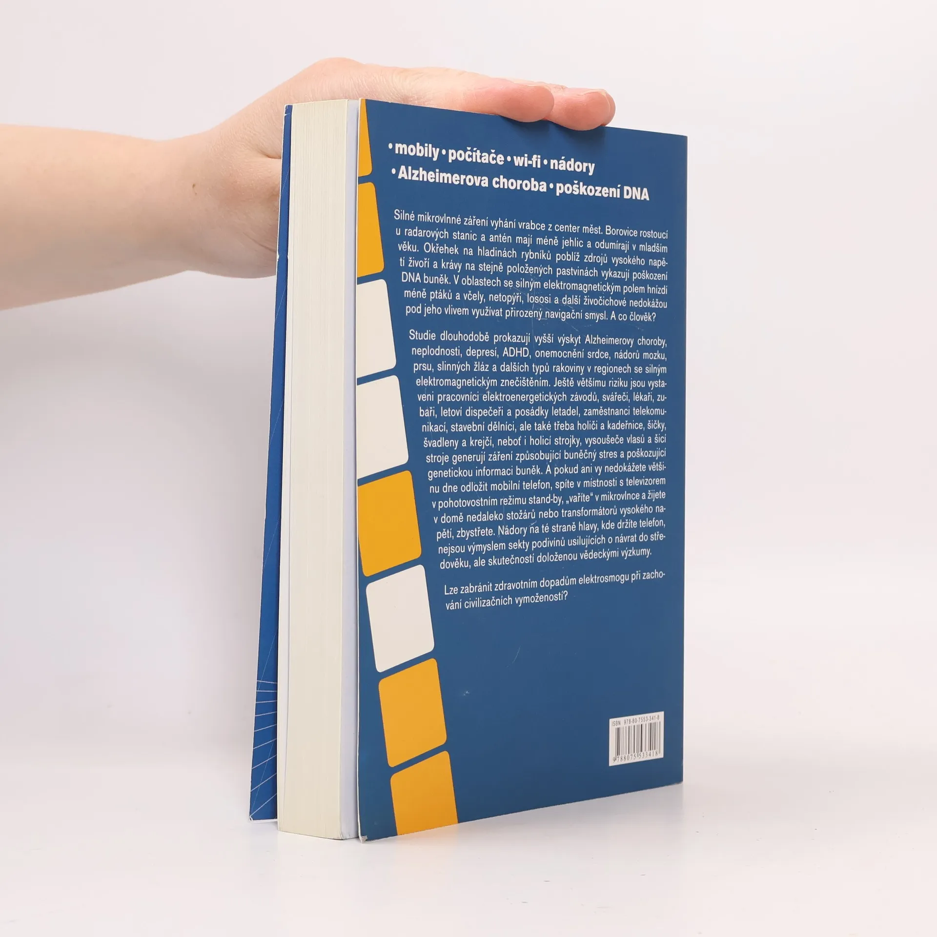 Silné mikrovlnné záření vyhání vrabce z městských center a borovice u radarových stanic odumírají v mladším věku. Okřehek v rybnících blízko zdrojů vysokého napětí živoří a krávy na pastvinách vykazují poškození DNA. V oblastech s elektromagnetickým polem hnízdí méně ptáků a další živočichové, jako včely a netopýři, nedokážou využívat přirozenou navigaci. Studie dlouhodobě ukazují vyšší výskyt Alzheimerovy choroby, neplodnosti, depresí, ADHD, srdečních onemocnění a různých typů rakoviny v oblastech s elektromagnetickým znečištěním. Pracovníci elektroenergetiky, svářeči, lékaři, letoví dispečeři a další profesní skupiny jsou vystaveni ještě většímu riziku, neboť i běžné přístroje jako holicí strojky a vysoušeče vlasů generují záření, které způsobuje buněčný stres. Pokud nedokážete odložit mobilní telefon, spíte v místnosti s televizorem v pohotovostním režimu a žijete blízko stožárů vysokého napětí, měli byste zbystřit. Nádory na straně hlavy, kde držíte telefon, nejsou mýtem, ale realitou potvrzenou vědeckými výzkumy. Lze zabránit zdravotním dopadům elektrosmogu při zachování civilizačních vymožeností?