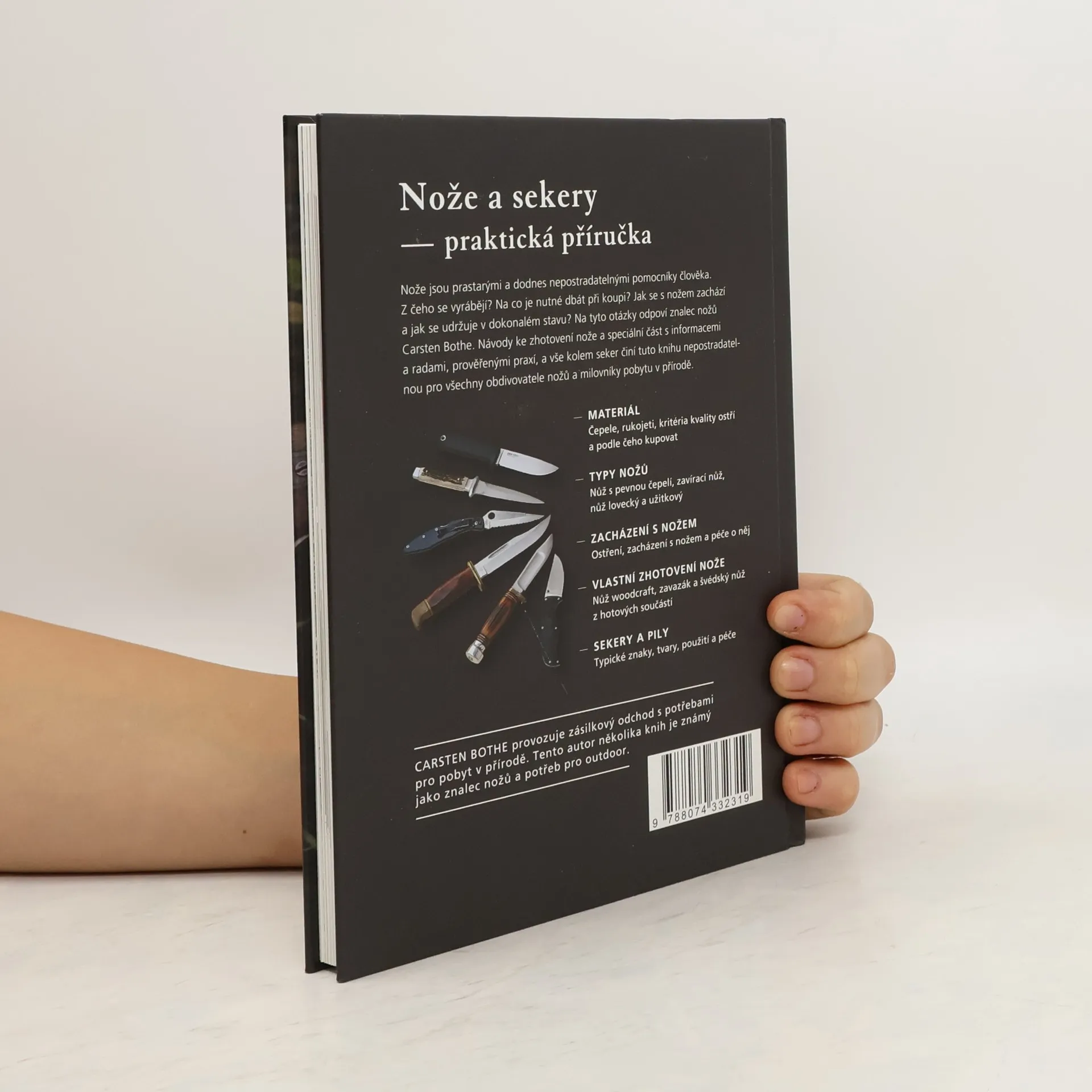 Nože a sekery - praktická příručka Nože jsou prastarými a dodnes nepostradatelnými pomocníky člověka. Z čeho se vyrábějí? Na co je nutné dbát při koupi? Jak se s nožem zachází a jak se udržuje v dokonalém stavu? Na tyto otázky odpoví znalec nožů Carsten Bothe. Návody ke zhotovení nože a speciální část s informacemi a radami, prověřenými praxí, a vše kolem seker činí tuto knihu nepostradatelnou pro všechny obdivovatele nožů a milovníky pobytu v přírodě. • MATERIÁL – Čepele, rukojeti, kritéria kvality ostří a podle čeho kupovat • TYPY NOŽŮ – Nůž s pevnou čepelí, zavírací nůž, nůž lovecký a užitkový • ZACHÁZENÍ S NOŽEM – Ostření, zacházení s nožem a péče o něj • VLASTNÍ ZHOTOVENÍ NŮŽE – Můž woodcraft, zavazák a švédský nůž z hotových součástí • SEKERY A PILY – Typické znaky, tvary, použití a péče CARSTEN BOTHE provozuje zásilkový odchod s potřebami pro pobyt v přírodě. Tento autor několika knih je známý jako znalec nožů a potřeb pro outdoor.
