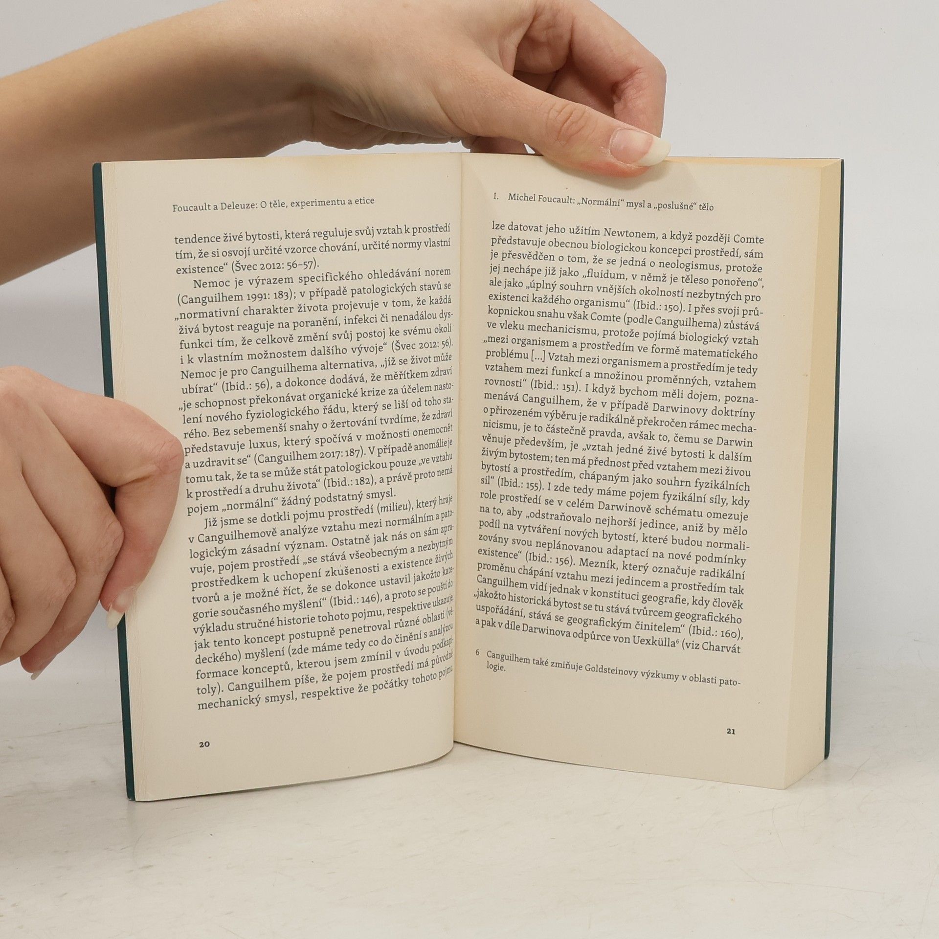 Cílem předložené monografie je uvedení do díla Michela Foucaulta a Gillesa Deleuze, zejména co se týče jejich uvažování o povaze vztahu jedince a společnosti. Toto vymezení slouží jako širší rámec pro následné vyznačení specifického pojetí etiky tak, jak se promítá ve Foucaultově „hermeneutice subjektu“ a v Deleuzově „etologii“. První část knihy má formu reflexe Foucaultových analýz psychiatrického diskurzu s ohledem na tematizaci vzájemné provázanosti témat „zdravé mysli“, „poslušného těla“ a „morálky“. Této reflexi je následně dodán širší rámec pozdějších Foucaultových úvah o různých způsobech vládnutí, přičemž nemohou být nechány stranou motivy singularity existence a experimentu, které konotují transverzální překračování daných norem. Druhá část monografie je věnována Deleuzovi, protože pro něj je etika vždy věcí našeho těla, respektive ohledáváním toho, co naše tělo dokáže, a tedy i rozšiřováním schopností našeho těla – experimentálního utváření našeho života. Experimentální utváření nás samotných se odehrává skrze událost, která je něčím, co nelze anticipovat, což vede k tematizaci vztahu mezi etikou a událostí. Monografie se tak snaží poukázat na fakt, že Foucaulta a Deleuze spojuje boj proti smutným vášním a resentimentu, boj proti veškerým formám podmanění.
