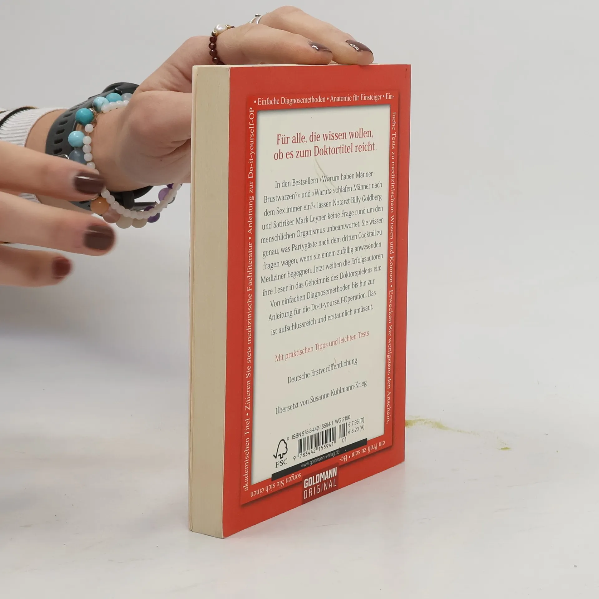 Verblüffend unterhaltsam In den beiden Bestsellern 'Warum haben Männer Brustwarzen?' und 'Warum schlafen Männer nach dem Sex immer ein?' lassen Notarzt Billy Goldberg und Satiriker Mark Leyner keine Frage rund um den menschlichen Organismus unbeantwortet. Sie wissen genau, was Partygäste nach dem dritten Cocktail zu fragen wagen, wenn sie einem zufällig anwesenden Mediziner begegnen. Jetzt weihen die Erfolgsautoren ihre Leser direkt in das Geheimnis des Doktorspielens ein. Das ist aufschlussreich und erstaunlich amüsant- von einfachen Diagnosemethoden bis hin zur Anleitung für die Do-it-yourself-Operation. Mit praktischen Tipps und leichten Tests: So sparen Sie den Gang zum Arzt samt Praxisgebühr.