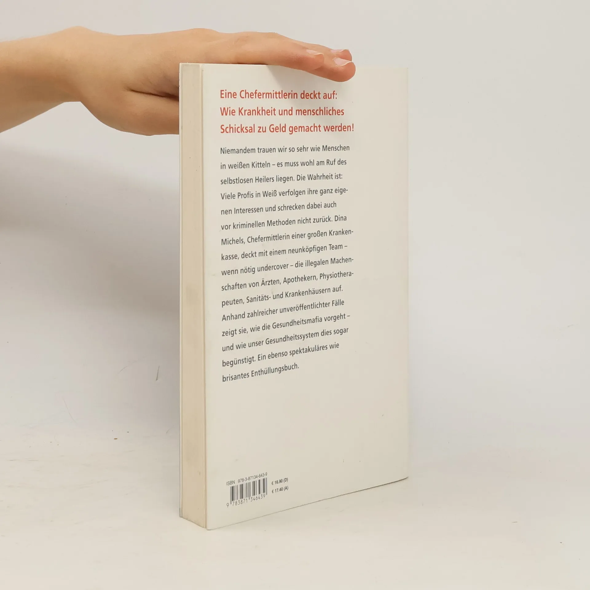 Eine Chefermittlerin deckt auf: Wie Krankheit und menschliches Schicksal zu Geld gemacht werden! Niemandem trauen wir so sehr wie Menschen in weißen Kitteln – es muss wohl am Ruf des selbstlosen Heilers liegen. Die Wahrheit ist: Viele Profis in Weiß verfolgen ihre ganz eigenen Interessen und schrecken dabei auch vor kriminellen Methoden nicht zurück. Dina Michels, Chefermittlerin einer großen Krankenkasse, deckt mit einem neunköpfigen Team – wenn nötig undercover – die illegalen Machenschaften von Ärzten, Apothekern, Physiotherapeuten, Sanitäts- und Krankenhäusern auf. Anhand zahlreicher unveröffentlichter Fälle zeigt sie, wie die Gesundheitsmafia vorgeht – und wie unser Gesundheitssystem dies sogar begünstigt. Ein ebenso spektakuläres wie brisantes Enthüllungsbuch.