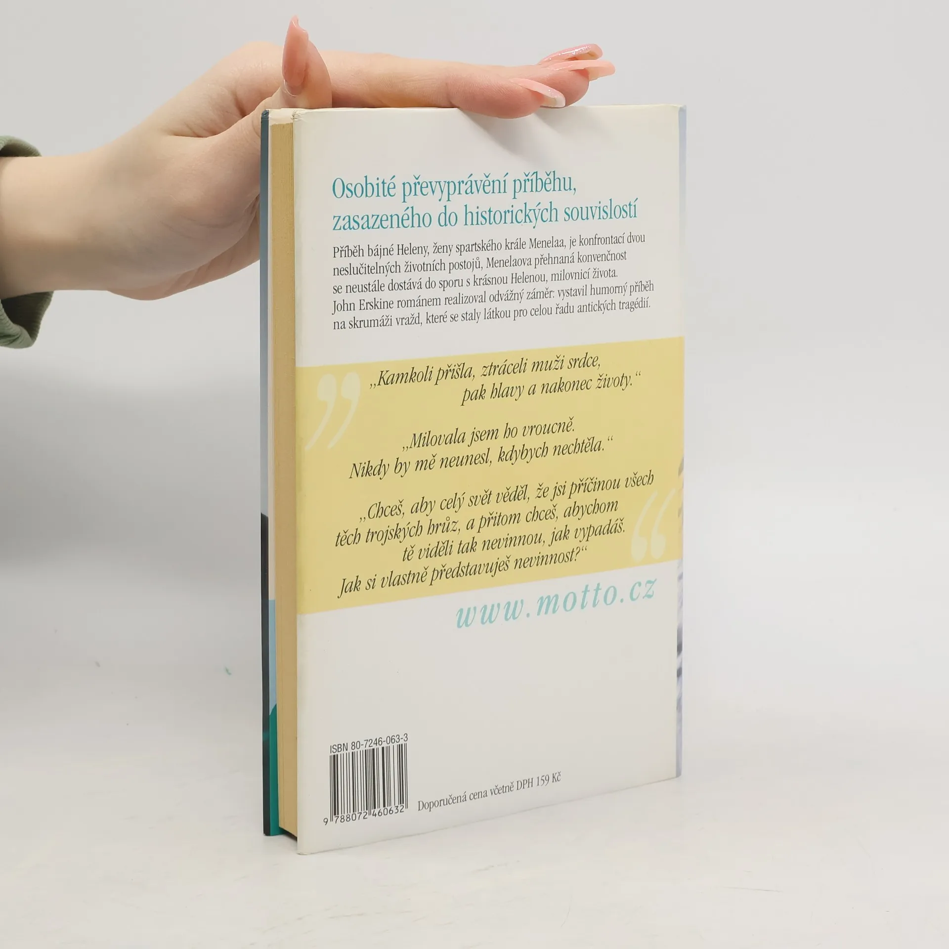 Humor je vzácné koření a autoři, kteří ho umějí rozdávat,by měli patřit k nejvzácnějším. Tím odvážnější je pak záměr vystavět humorný příběh na skrumáži vražd, které poskytly látku k celé řadě proslulých řeckých tragédií. Příběh Heleny, Meneláa a Parida je všeobecně znám. John Erskine se rozhodl interpretovat příběh jinak. Šlo mu spíš o to postavit proti sobě dvě životní filozofie. Jedna - reprezentovaná bezradným a vždy znovu trapným Meneláem - se pokouší vtěsnat život do zkostnatělých konvencí, druhá - Helenina - je naplněna láskou k životu. Dvě neslučitelné koncepce, dva prototypy, mužský a ženský. Knížka plná jemné ironie, duchaplných dialogů a bystrých filozofických postřehů.