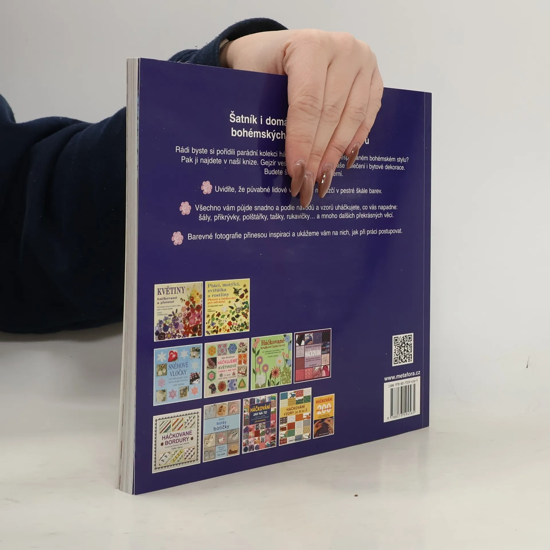 Šatník i domácnost rozsvítí záplava bohémských háčkovaných výtvorů. Rádi byste si pořídili parádní kolekci háčkovaných výrobků v nespoutaném bohémském stylu? Pak vám nabízíme tři desítky úžasných pestrobarevných modelů inspirovaných tradičními lidovými vzory. Tato jedinečná sbírka háčkovaných doplňků obsahuje projekty, jejichž výroba je rychlá a snadná, jako jsou třeba polštářky a nejrůznější malé podložky. Najdete zde ale i rozměrnější výrobky, například šály či deky, jejichž zhotovení zabere o něco více času. Uvidíte, že půvabné lidové vzory jsou nejhezčí v pestré škále barev. Všechno vám půjde snadno a podle návodů a vzorů našich talentovaných umělkyň uháčkujete, co jen vás napadne: tašky, rukavičky… a mnoho dalších překrásných věcí. Seznámíte se s fantastickými technikami háčkování a získáte spoustu inspirace. Barevné fotografie vám pomohou pochopit, jak přesně při práci postupovat a jak úžasné věci vás na konci čekají. Ohňostroj veselých barev rozzáří vaše oblečení i bytové dekorace a vnese do vašeho domova i šatníku duhovou vlnu bohémské elegance. Budete šik, originální a moderní.