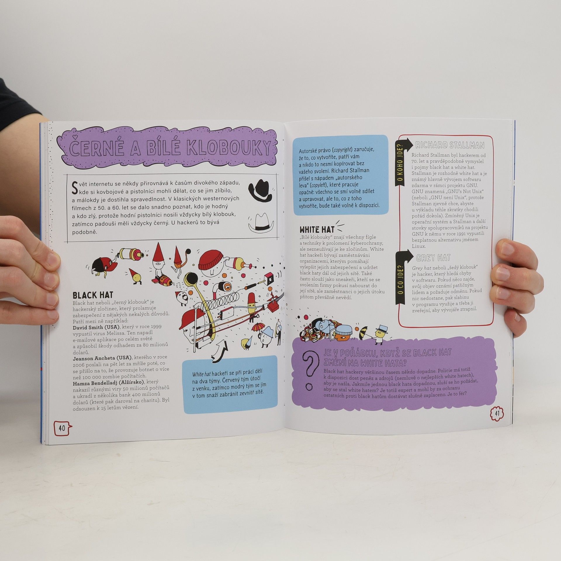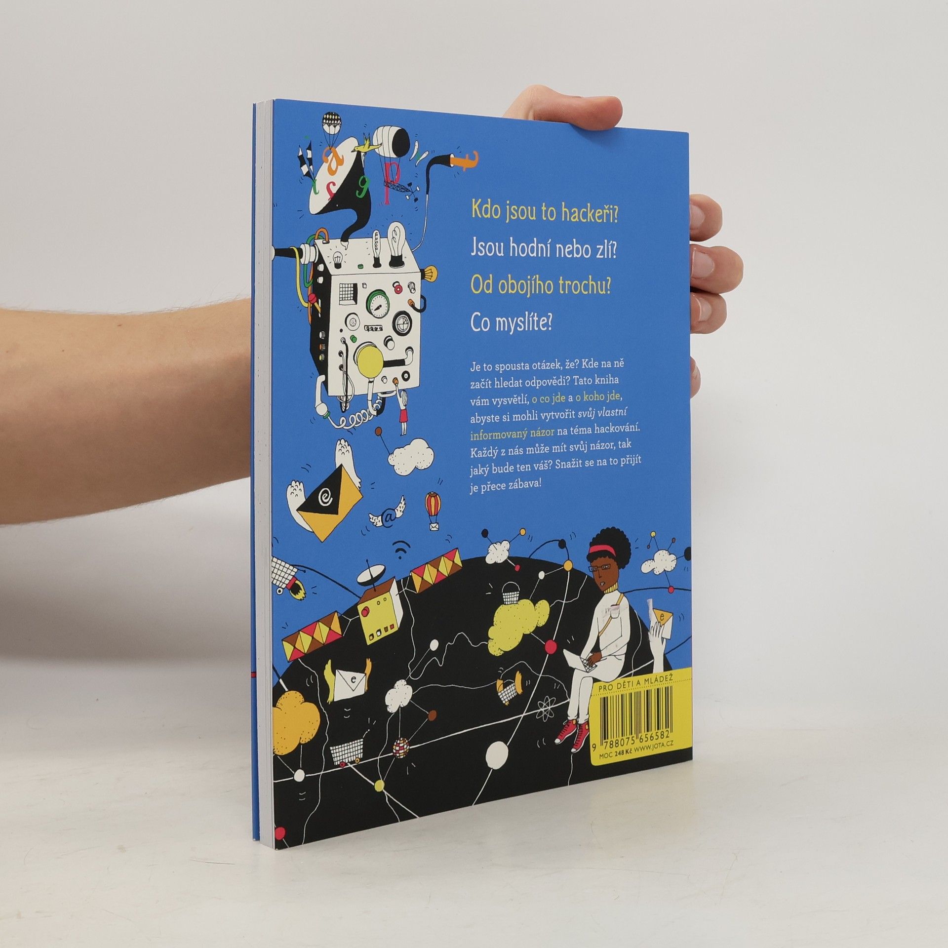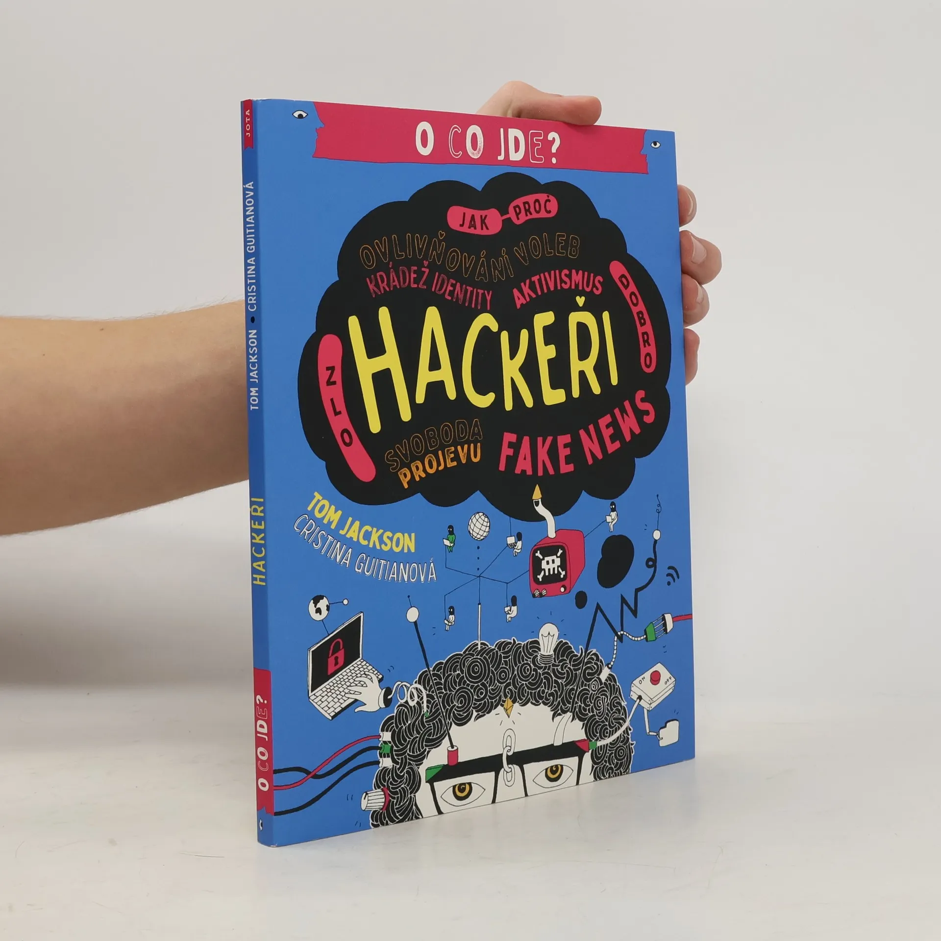 Kdo jsou to hackeři? Jsou hodní nebo zlí? Od obojího trochu? Co myslíte? Je to spousta otázek, že? Kde na ně začít hledat odpovědi? Tato kniha vám vysvětlí, o co jde a o koho jde, abyste si dokázali vytvořit svůj vlastní informovaný názor na téma hackování. Každý z nás může mít svůj názor, tak jaký bude ten váš? Snažit se na to přijít je přece zábava! Měl by být státům umožněn přístup k záznamům veškeré komunikace? Jakou míru soukromí by měl člověk očekávat? Komu patří internet? Tento fascinující úvod do široké problematiky internetu a internetové bezpečnosti vám tyto otázky přiblíží skrze témata jako špionáž, šifrování a temný web. Knižní série O co jde? vás vyzbrojí vědomostmi, díky nimž dokážete obhájit své argumenty a své přesvědčení s jistotou. Každý z nás může mít svůj názor, tak ať je ten váš opřený o informace. Série se zabývá napínavými tématy mnoha článků a veřejných debat, nad kterými jistě stojí za to se zamyslet. Ptá se, „proč se vlastně kolem toho dělá takový povyk“, předkládá klíčová fakta a zkoumá to, co je dobré i špatné na každém případu. V těchto knihách najdou mladí čtenáři vše, co potřebují vědět o současných důležitých tématech, a budou si tak moci vytvořit svůj vlastní názor.