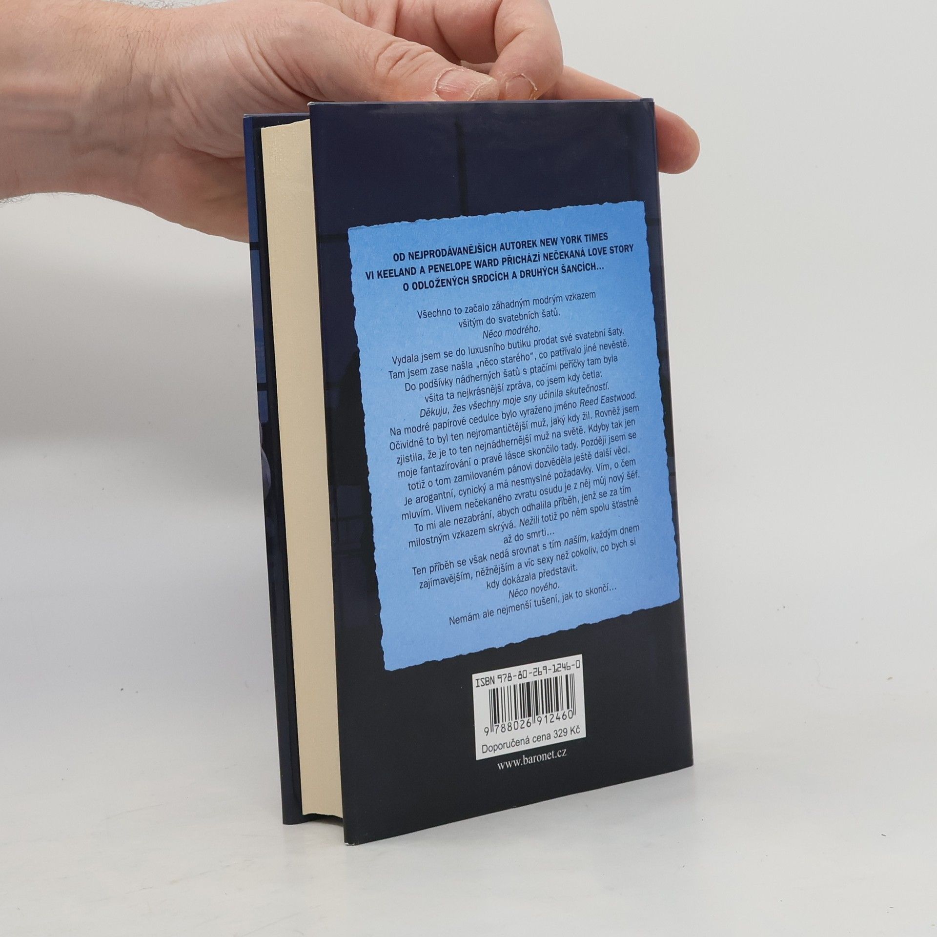Od nejprodávanějších autorek New York Times Vi Keeland a Penelope Ward přichází nečekaná love story o odložených srdcích a druhých šancích… Všechno to začalo záhadným modrým vzkazem všitým do svatebních šatů. Něco modrého. Vydala jsem se do luxusního butiku prodat své vlastní svatební šaty. Tam jsem zase našla „něco starého“, co patřívalo jiné nevěstě. Do podšívky nádherných šatů s motivem ptačích per tam byla všita ta nejkrásnější zpráva, co jsem kdy četla: Děkuju ti, že jsi mi splnila všechny moje sny. Na modré papírové cedulce bylo vyraženo jméno Reed Eastwood. Očividně to byl ten nejromantičtější muž, jaký kdy žil. Rovněž jsem zjistila, že je to ten nejnádhernější muž na světě. Kdyby jen moje fantazírování o pravé lásce tady skončilo. Později jsem totiž o tom zamilovaném pánovi zjistila ještě další věci. Je arogantní, cynický a má nesmyslné požadavky. Vím, o čem mluvím. Vlivem nečekaného zvratu osudu je z něj můj nový šéf. To mě ale nezastaví, abych odhalila příběh, jenž se za tím milostným vzkazem skrývá. Milostným vzkazem, po němž spolu nežili šťastně až do smrti… Ten příběh se však nedá srovnat s tím naším, každým dnem zajímavějším, něžnějším a víc sexy než cokoliv, co bych si kdy dokázala představit. Něco nového. Nemám ale nejmenší tušení, jak to skončí…