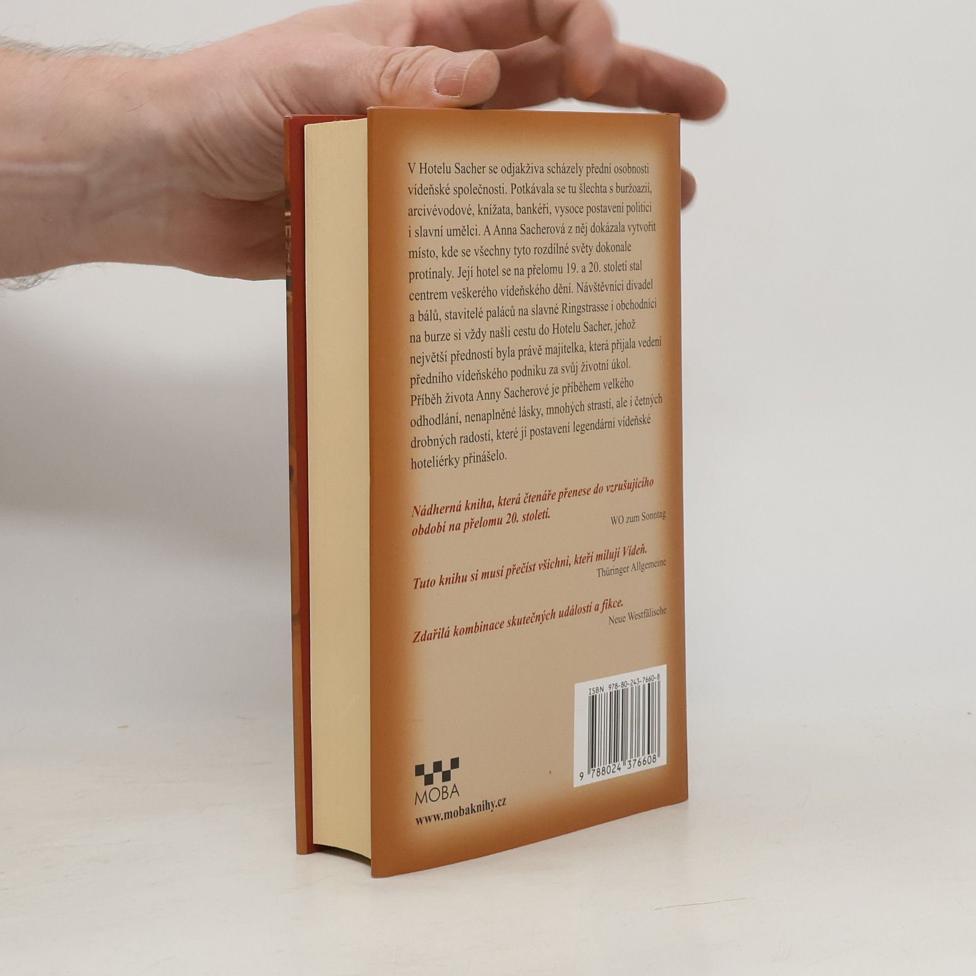 Příběh o legendární majitelce hotelu Anně Sacherové, v jejímž životě se odráží sláva a pád nejslavnější vídeňské epochy. Jedinou dědičku a legendární šéfovou Hotelu Sacher z doby na přelomu století proslavili jednak její významní hosté a jednak vytříbený smysl pro vídeňský společenský život. Dokázala vytvořit místo, na kterém se odehrávaly pohnuté dějinné události, kde měly věci svůj průsečík: dvůr, šlechta, peníze, průmysl, moc. Setkávali se tu secesní umělci, hudebníci a spisovatelé, nejvyšší světová elita slavné doby. Monika Czernin vypráví příběh jednoho mimořádného života a zároveň barvitě líčí významnou epochu evropských kulturních dějin.