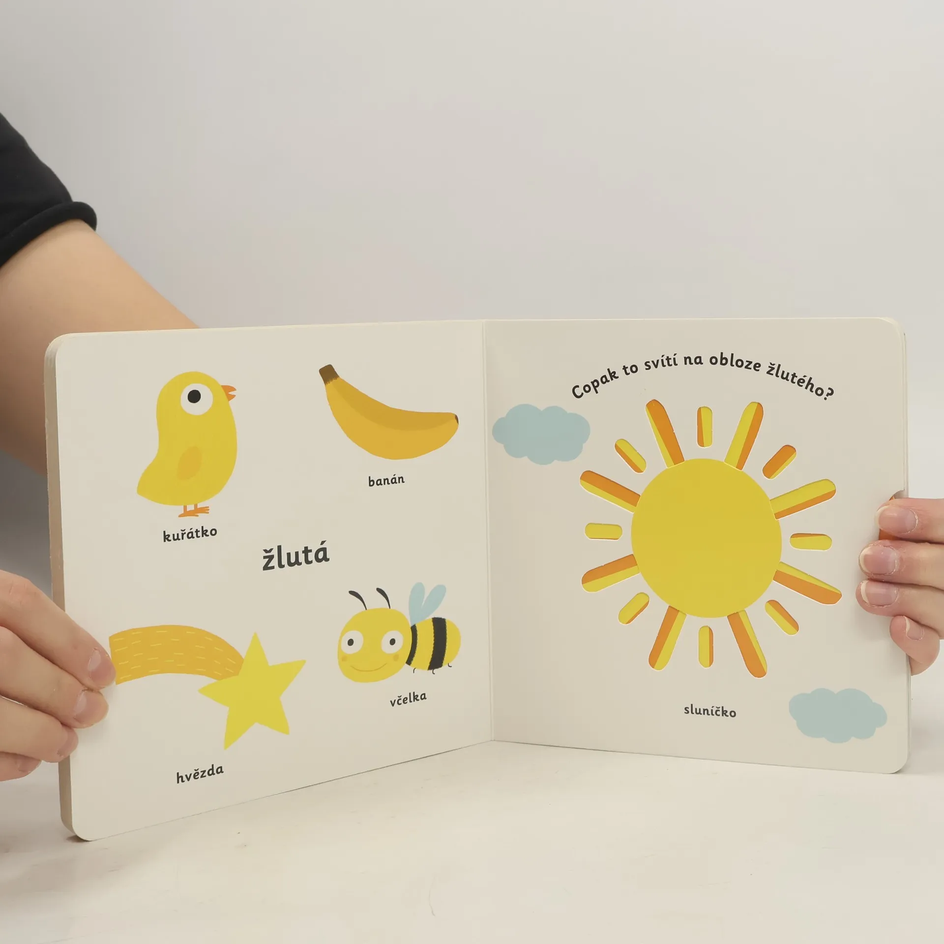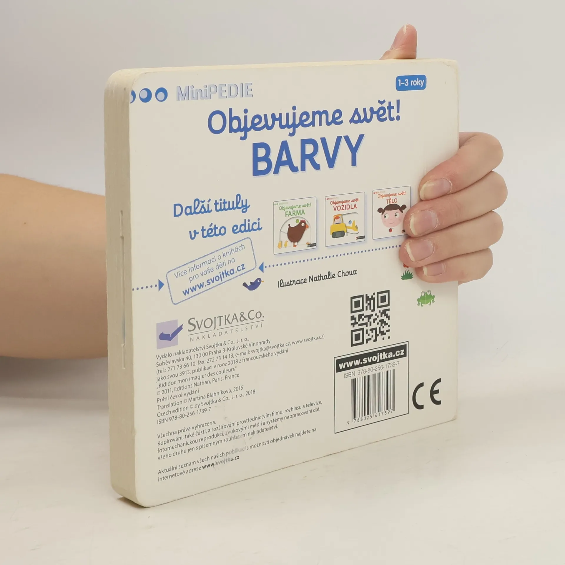 Objevovat svět barev s tímto leporelem je tak zábavné! Jak se jmenuje toto červené ovoce? Co je to za obrovské modré zvíře? Copak to svítí na obloze žlutého? Jak se jmenuje toto zelené zvířátko? Stačí jen vložit prstík do správného otvoru a lehce vysunout, zatáhnout nebo otočit ve směru šipky a hned bude váš malý objevitel znát odpovědi. Leporelo je určeno pro nejmenší děti od jednoho roku a má pevné stránky s posuvnými a otočnými prvky, a tak si naši nejmenší mohou při prohlížení a učení základních barev procvičit i jemnou motoriku.