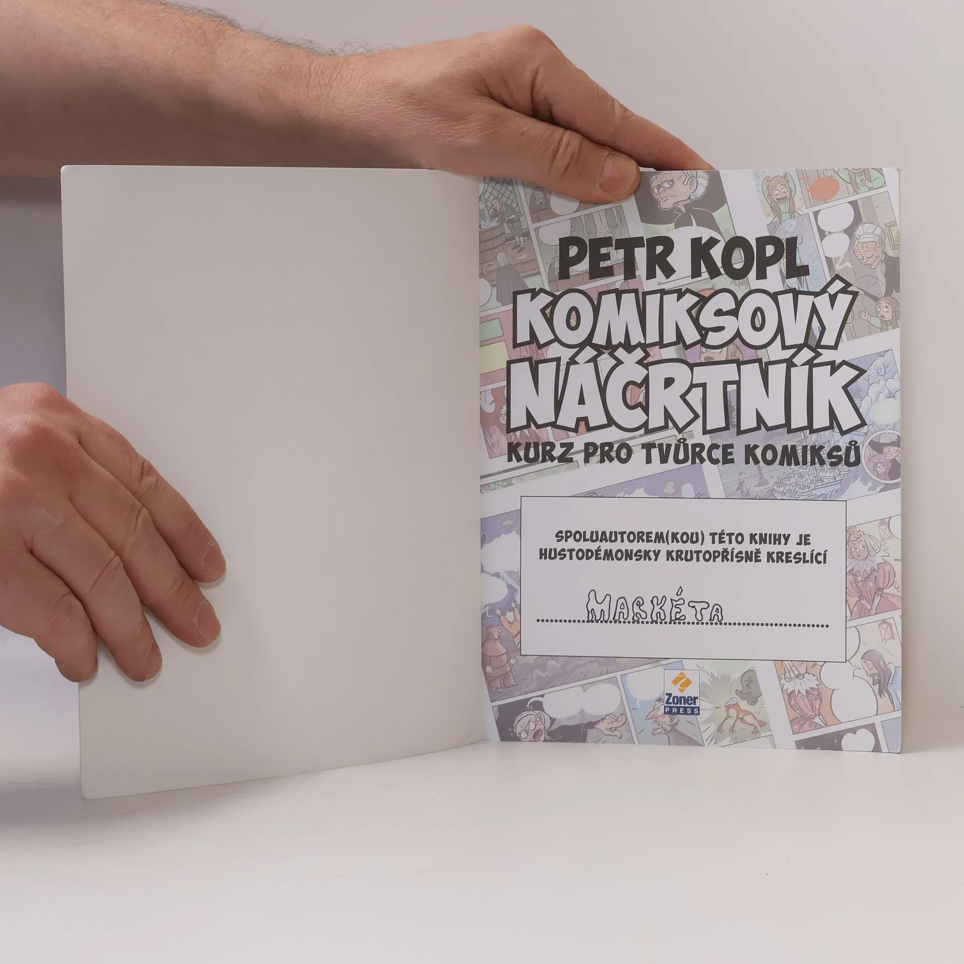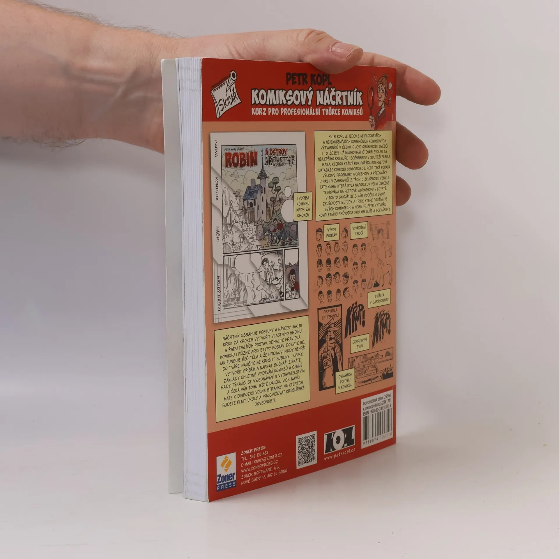 Staňte se úspěšnými tvůrci komiksu pod vedením zkušeného komiksového výtvarníka Petra Kopla. Odhalí vám všechna tajemství tohoto specifického výtvarného odvětví. Od toho, jak vytvořit vlastního hrdinu, přes kreslení různých dalších postav, zvířat a prostředí, bublin, psaní textů, textové efekty, rozvržení panelů, barvení až po vytvoření kompletního komiksu včetně scénáře a to, jak jednat s vydavatelem a co vše si předtím připravit. Komiksový náčrtník, jak už název napovídá, slouží k tomu, abyste do něj kreslili. Autor si pro vás připravil řadu úkolů, které budete průběžně vypracovávat a ihned procvičovat na volné listy speciálně uzpůsobené pro vaše kresby. Postupně si tak osvojíte všechny schopnosti potřebné pro úspěšné zvládnutí komiksové tvorby. Náčrtník je určený začátečníkům i profesionálům, mladým i starým, všem, co rádi kreslí, mají rádi komiks nebo tvorbu Petra Kopla. Pokud si s vypracováním úkolů nebudete vědět rady, můžete si pomocí odkazu, který najdete uvnitř knihy, stáhnout ukázky toho, jak úkoly vypracoval sám autor.