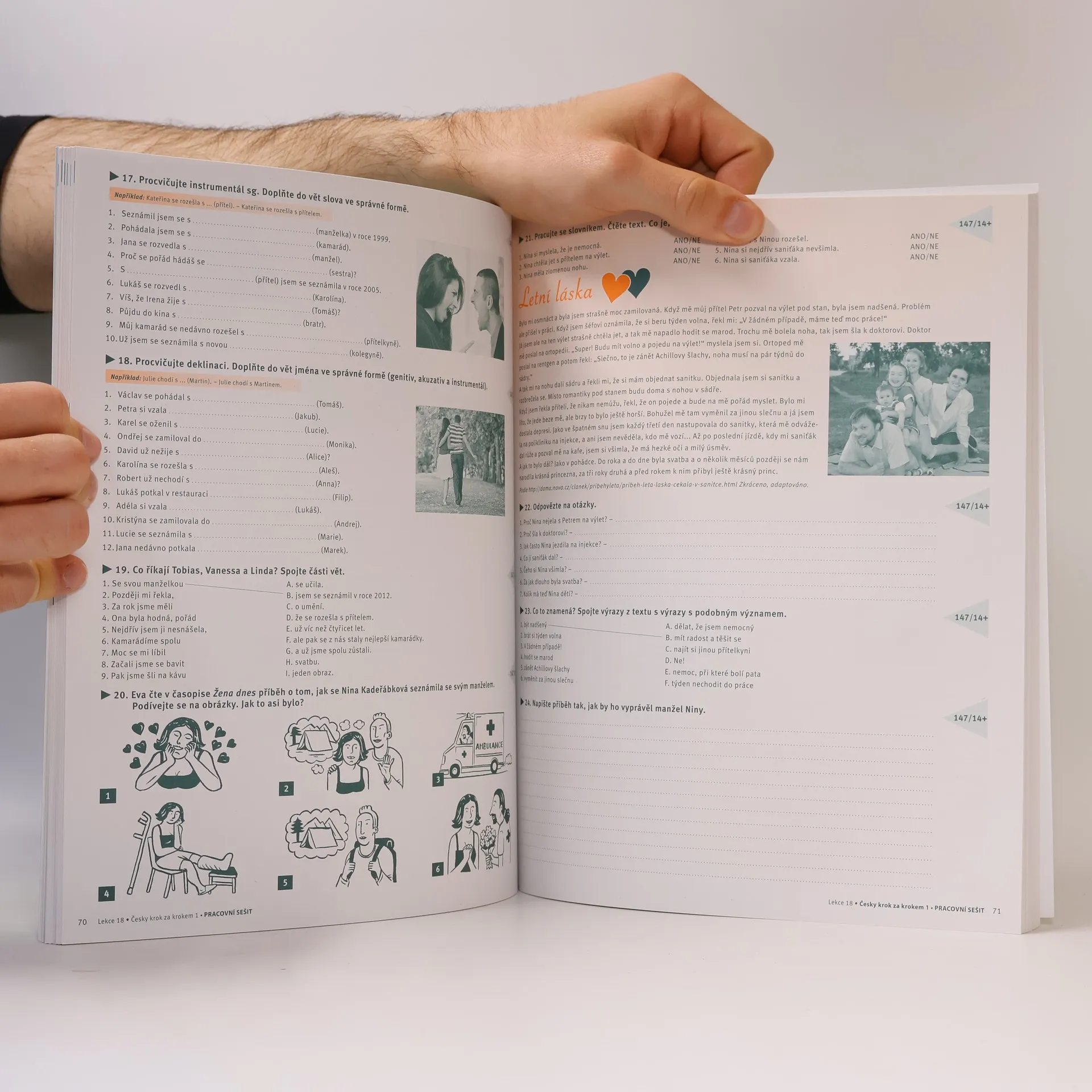 Pracovní sešit 13–24 je součástí učebnice češtiny pro začátečníky na úrovních A1-A2. Obsahuje cvičení zaměřená na rozvoj jazykových dovedností, včetně čtení, psaní, poslechu a mluvení. Každá kapitola se věnuje různým tématům, jako jsou každodenní situace, rodina, volný čas a cestování, což pomáhá studentům osvojit si základní slovní zásobu a gramatiku. Sešit nabízí praktické úkoly, které podporují aktivní učení a usnadňují procvičování jazyka v kontextu. Důraz je kladen na interakci a komunikaci, což umožňuje studentům lépe se orientovat v reálných situacích. Tento pracovní sešit je určen pro samostatné učení i jako doplněk k výuce ve třídě.