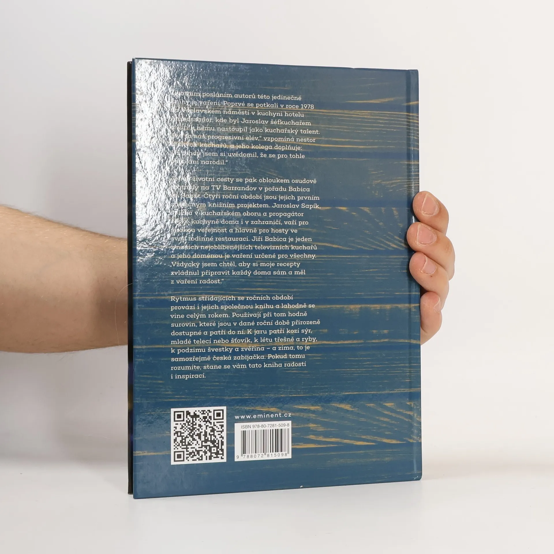 Životním posláním autorů této jedinečné knihy je vaření. Poprvé se potkali v roce 1978, na Václavském náměstí v kuchyni hotelu Ambassador, kde byl Jaroslav šéfkuchařem a Jiří k němu nastoupil jako kuchařský talent. „Byl to náš progresivní elév,“ vzpomíná nestor českých kuchařů a jeho kolega doplňuje: „Už tehdy jsem si uvědomil, že se pro tohle povolání narodil.“ Jejich životní cesty se pak obloukem osudově protnuly na Barrandově. Čtyři roční období jsou jejich prvním společným knižním projektem. Jaroslav Sapík, špička v kuchařském oboru a propagátor české kuchyně doma i v zahraničí, vaří pro širokou veřejnost a hlavně pro hosty ve svojí rodinné restauraci. Jiří Babica je jeden z našich nejoblíbenějších televizních kuchařů a jeho doménou je vaření určené pro všechny. „Vždycky jsem chtěl, aby si moje recepty zvládnul připravit každý doma sám a měl z vaření radost.“ Rytmus střídajících se ročních období provází i jejich společnou knihu a lahodně se vine celým rokem. Používají při tom hodně surovin, které jsou v dané roční době přirozeně dostupné a patří do ní. K jaru patří kozí sýr, mladé telecí nebo šťovík, k létu třešně a ryby, k podzimu švestky a zvěřina – a zima, to je samozřejmě česká zabijačka. Pokud tomu rozumíte, stane se vám tato kniha radostí i inspirací.
