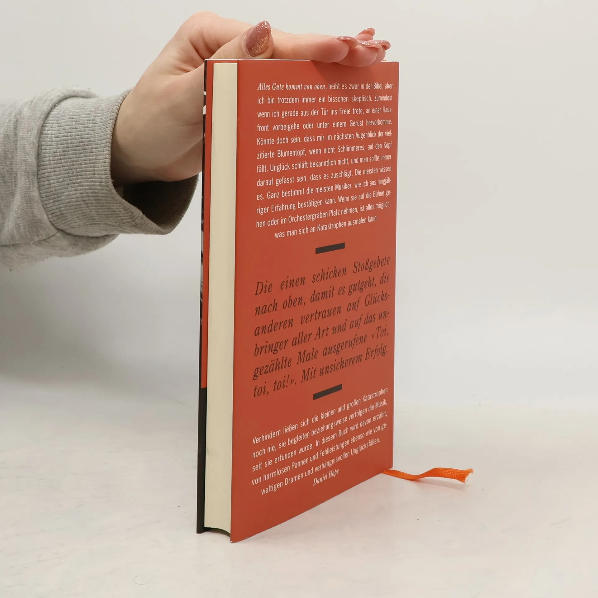 Alles Gute kommt von oben, heißt es zwar in der Bibel, aber ich bin trotzdem immer ein bisschen skeptisch. Zumindest wenn ich gerade aus der Tür ins Freie trete, an einer Hausfront vorbeigehe oder unter einem Gerüst hervorkomme. Könnte doch sein, dass mir im nächsten Augenblick der vielzitierte Blumentopf, wenn nicht Schlimmeres, auf den Kopf fällt. Unglück schläft bekanntlich nicht, und man sollte immer darauf gefasst sein, dass es zuschlägt. Die meisten wissen es. Ganz bestimmt die meisten Musiker, wie ich aus langjähriger Erfahrung bestätigen kann. Wenn sie auf die Bühne gehen oder im Orchestergraben Platz nehmen, ist alles möglich, was man sich an Katastrophen ausmalen kann. Die einen schicken Stoßgebete nach oben, damit es gutgeht, die anderen vertrauen auf Glücksbringer aller Art und auf das ungezählte Male ausgerufene «Toi, toi, toi!». Mit unsicherem Erfolg. Verhindern ließen sich die kleinen und großen Katastrophen noch nie, sie begleiten beziehungsweise verfolgen die Musik, seit sie erfunden wurde. In diesem Buch wird davon erzählt, von harmlosen Pannen und Fehlleistungen ebenso wie von gewaltigen Dramen und verhängnisvollen Unglücksfällen. Daniel Hope