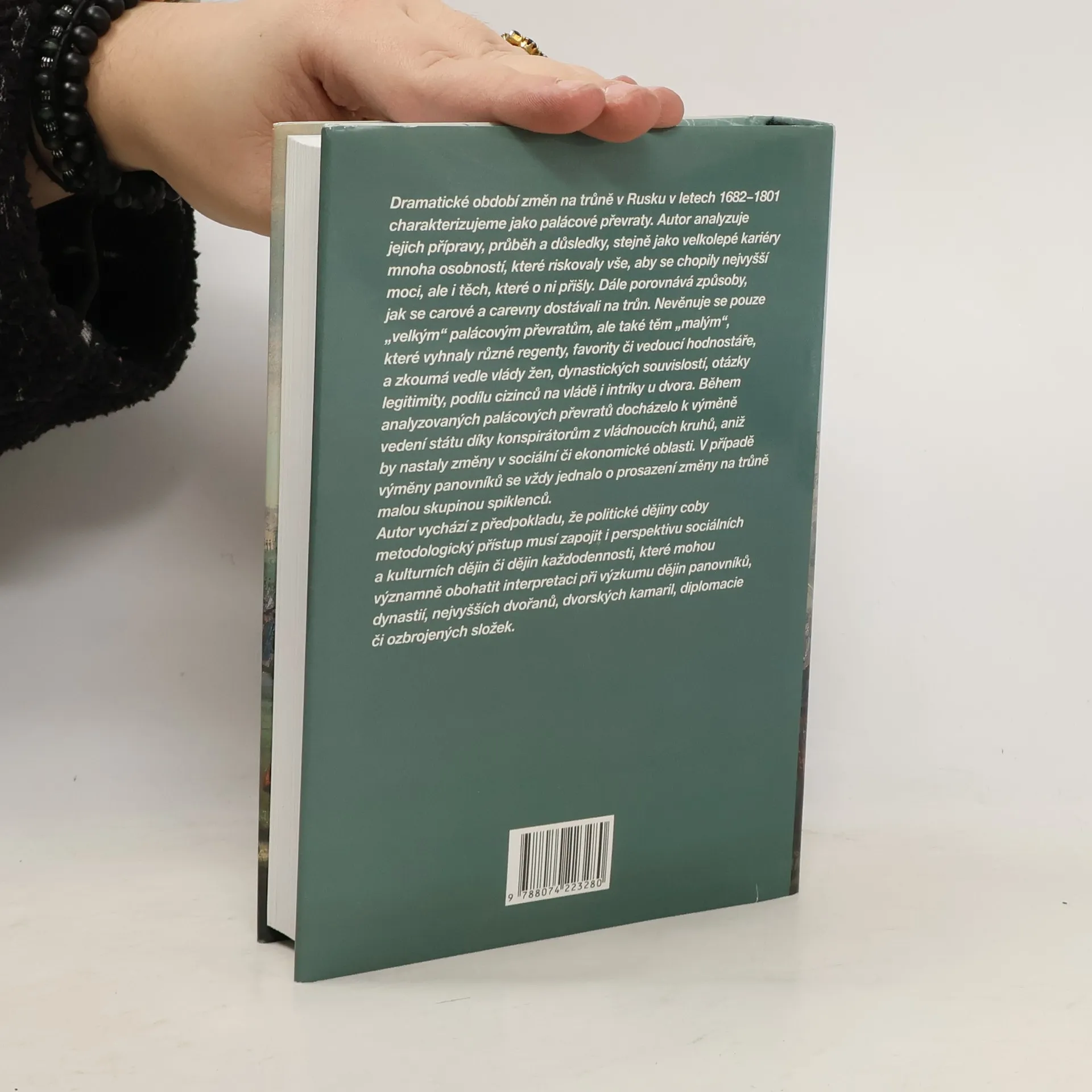 Dramatické období změn na trůně v Rusku v letech 1682-1801 charakterizujeme jako palácové převraty. Autor analyzuje jejich přípravy, průběh a důsledky, stejně jako velkolepé kariéry mnoha osobností, které riskovaly vše, aby se chopily nejvyšší moci, ale i těch, které o ni přišly. Dále porovnává způsoby, jak se carové a carevny dostávali na trůn. Nevěnuje se pouze "velkým" palácovým převratům, ale také těm "malým", které vyhnaly různé regenty, favority či vedoucí hodnostáře, a zkoumá vedle vlády žen, dynastických souvislostí, otázky legitimity, podílu cizinců na vládě i intriky u dvora. Autor vychází z předpokladu, že politické dějiny coby metodologický přístup musí zapojit i perspektivu sociálních a kulturních dějin každodennosti, které mohou významně obohatit interpretaci při výzkumu dějin panovníků, dynastií, nejvyšších dvořanů, dvorských kamaril, diplomacie či ozbrojených složek.