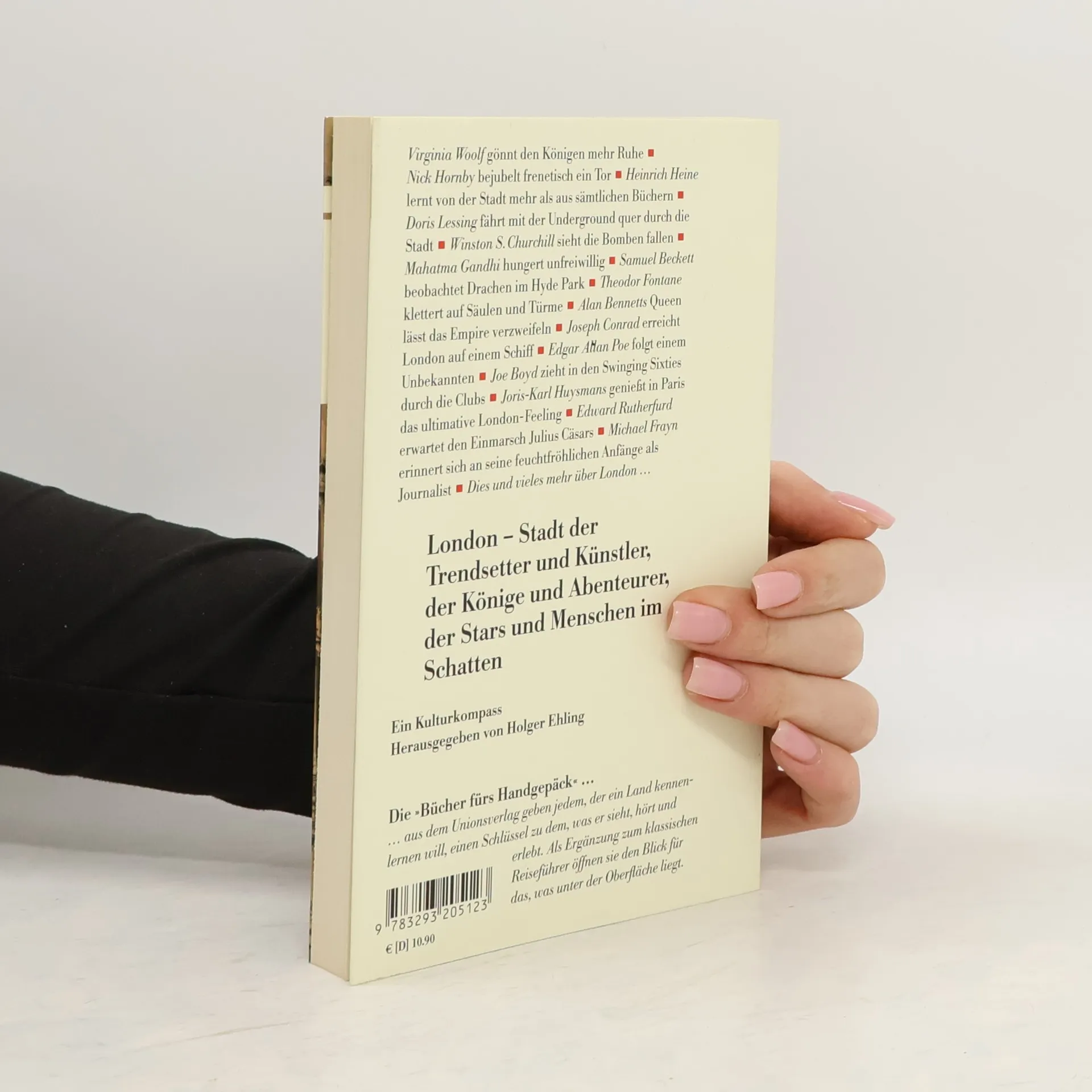 Virginia Woolf gönnt den Königen mehr Ruhe Nick Hornby bejubelt frenetisch ein Tor Heinrich Heine lernt von der Stadt mehr als aus sämtlichen Büchern Doris Lessing fährt mit der Underground quer durch die Stadt Winston S. Churchill sieht die Bomben fallen Mahatma Gandhi hungert unfreiwillig Samuel Beckett beobachtet Drachen im Hyde Park Theodor Fontane klettert auf Säulen und Türme Alan Bennetts Queen lässt das Empire verzweifeln Joseph Conrad erreicht London auf einem Schiff Edgar Allan Poe folgt einem Unbekannten Joe Boyd zieht in den Swinging Sixties durch die Club Joris-Karl Huysmans genießt in Paris das ultimative London-Feeling Edward Rutherfurd erwartet den Einmarsch Julius Cäsars Michael Frayn erinnert sich an seine feuchtfröhlichen Anfänge als Journalist Dies und vieles mehr über London …