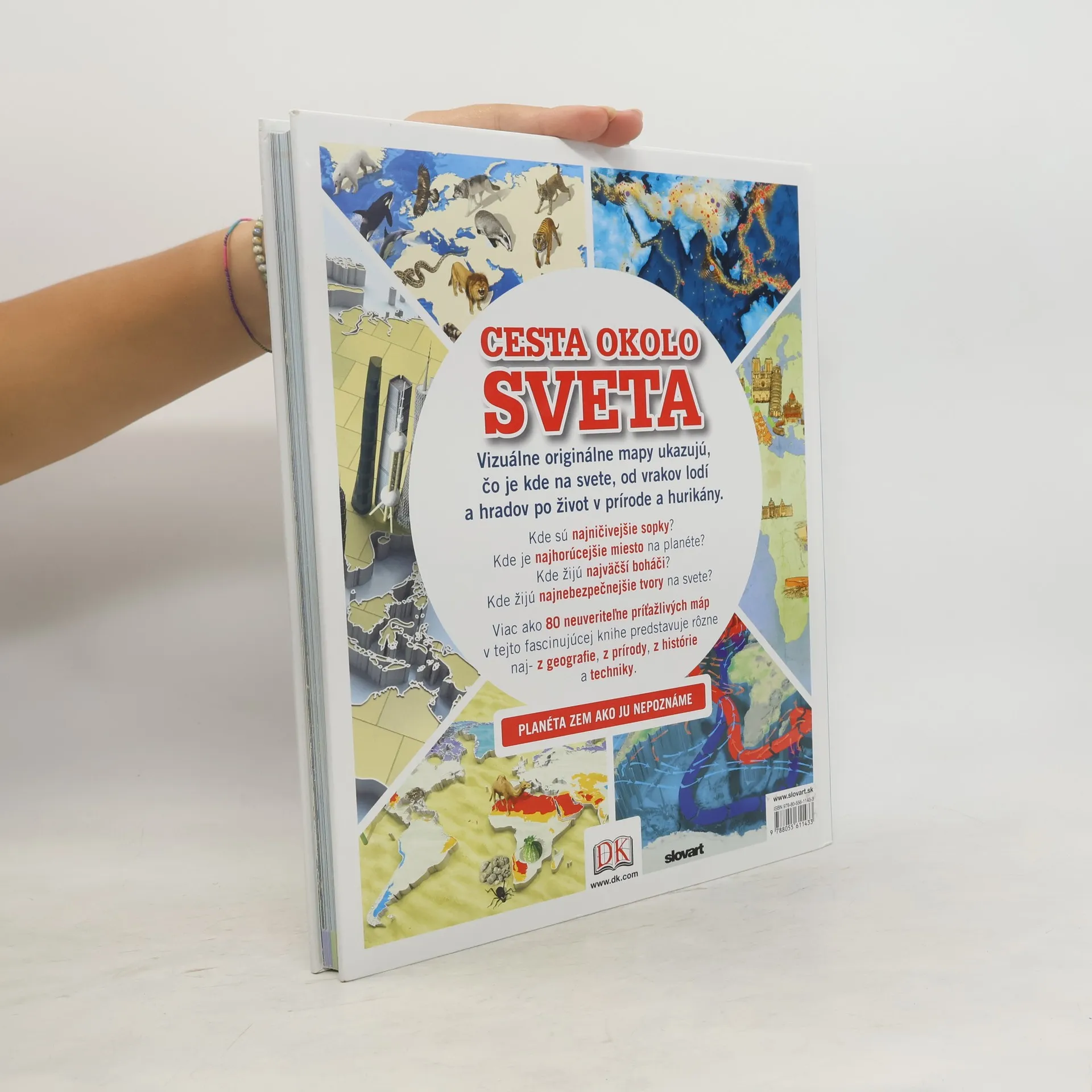 Okolo sveta je unikátna obrazová encyklopédia so 75 plnofarebnými mapami, ktoré ukazujú, kde na svete sú najvyššie budovy, najdlhšie rieky, najnebezpečnejšie zemetrasenia alebo kde nájdete zvieratá, ktoré svetielkujú. Témy sú rozdelené do šiestich kapitol: Geografia, Príroda, Ľudia, História, Umenie a zábava, Veda a technológie. Ak potrebujete vedieť, kde sa najlepšie potápa za vrakmi alebo kde žije najviac miliardárov, táto kniha je práve pre vás. Vyberte sa na jedinečný výlet po svete a objavte, kde sa čo deje. Pre čitateľov od 10 rokov.