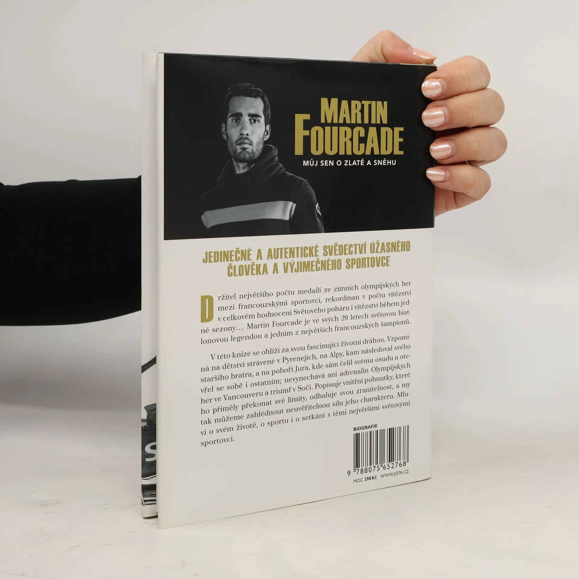Držitel největšího počtu medailí ze zimních olympijských her mezi francouzskými sportovci, rekordman v počtu vítězství v celkovém hodnocení Světového poháru i vítězství během jedné sezony… Martin Fourcade je ve svých 28 letech světovou biatlonovou legendou a jedním z největších francouzských šampionů. V této knize se ohlíží za svou fascinující životní dráhou. Vzpomíná na dětství strávené v Pyrenejích, na Alpy, kam následoval svého staršího bratra, a na pohoří Jura, kde sám čelil svému osudu a otevřel se sobě i ostatním; nevynechává ani adrenalin Olympijských her ve Vancouveru a triumf v Soči. Popisuje vnitřní pohnutky, které ho přiměly překonat jeho limity, odhaluje svou zranitelnost, a my tak můžeme zahlédnout neuvěřitelnou sílu jeho charakteru. Mluví o svém životě, o sportu i o setkání s těmi největšími světovými sportovci. Martin Fourcade. Můj sen o zlatě a sněhu je jedinečné a autentické svědectví úžasného člověka a výjimečného sportovce. Napsáno ve spolupráci s Jeanem Issartelem. První vydání.