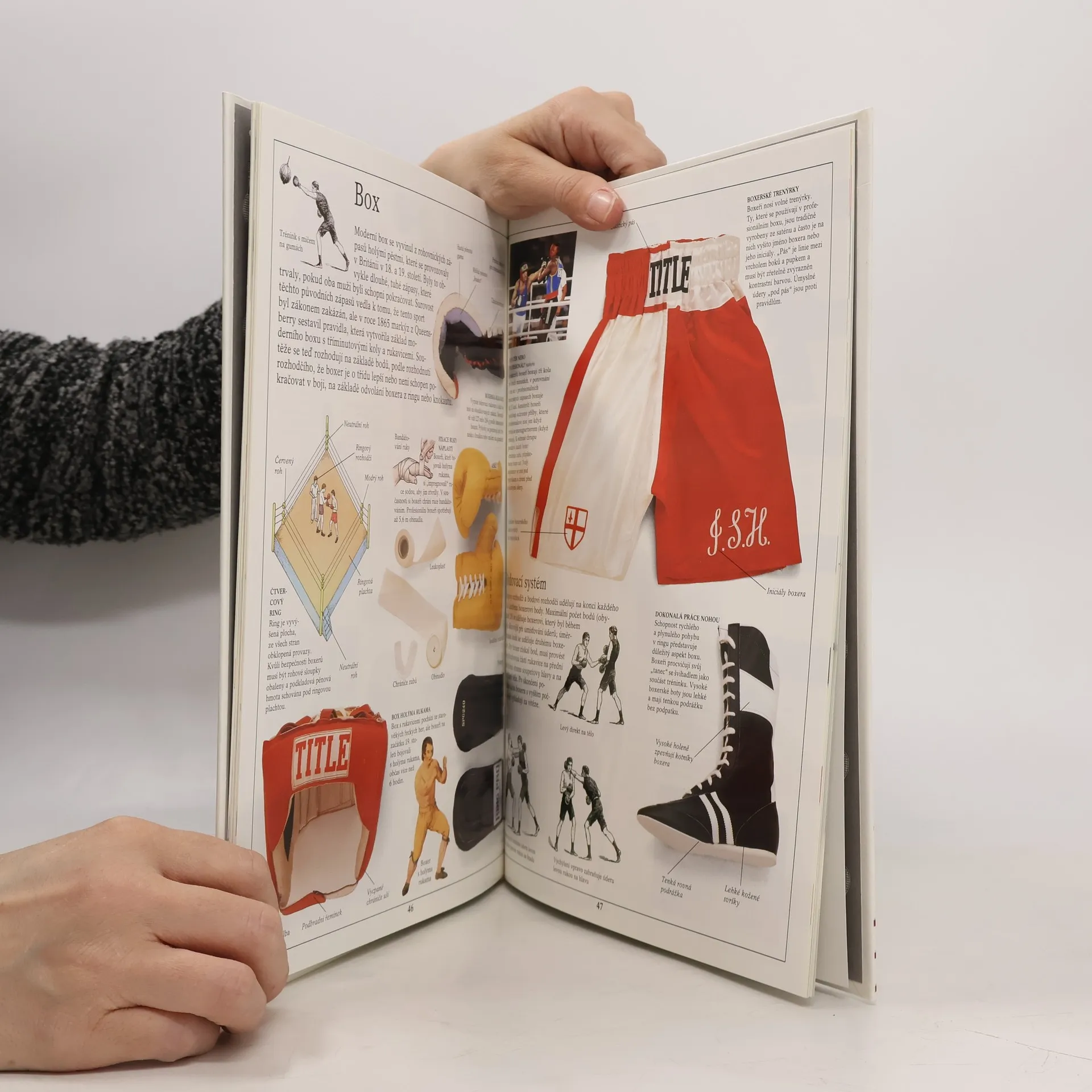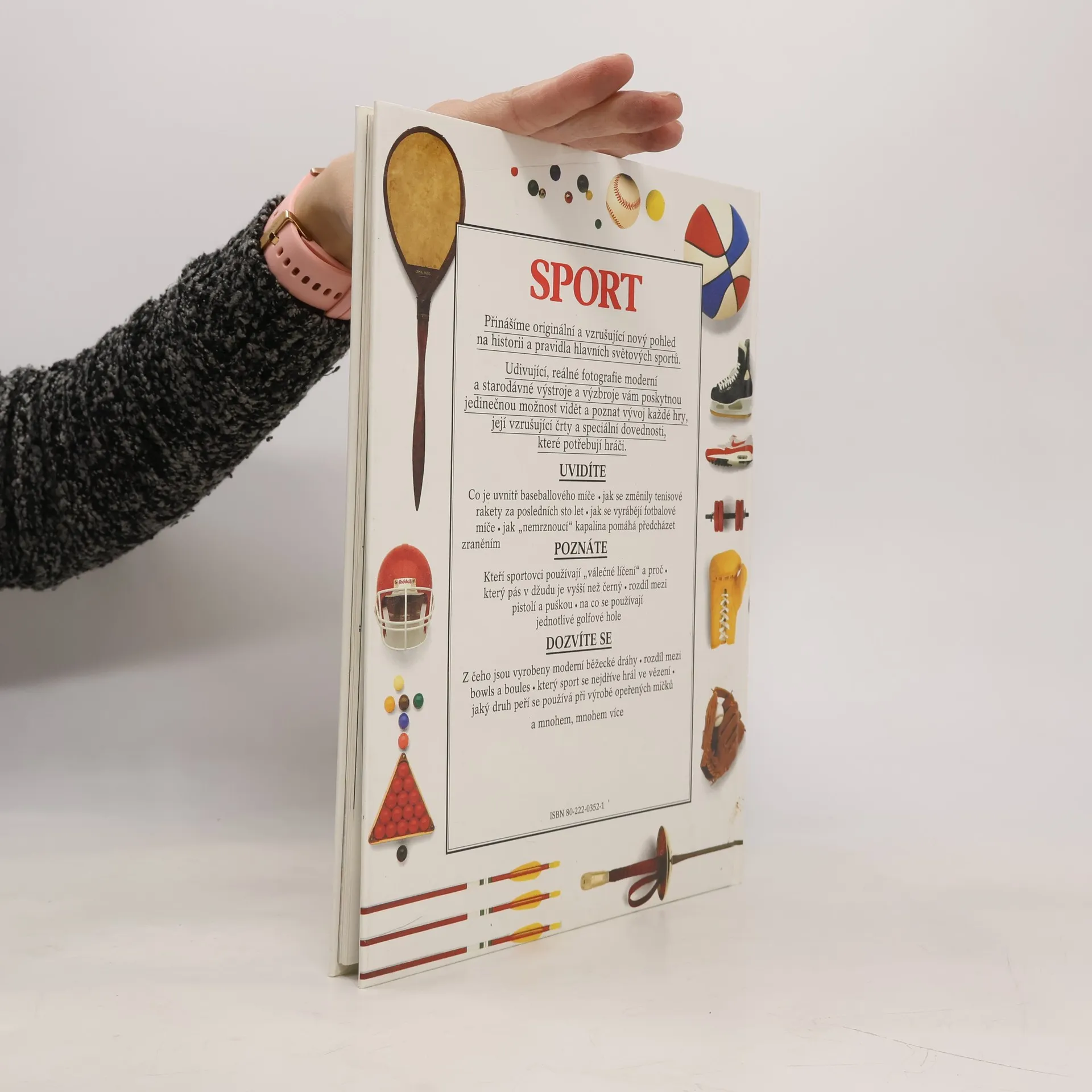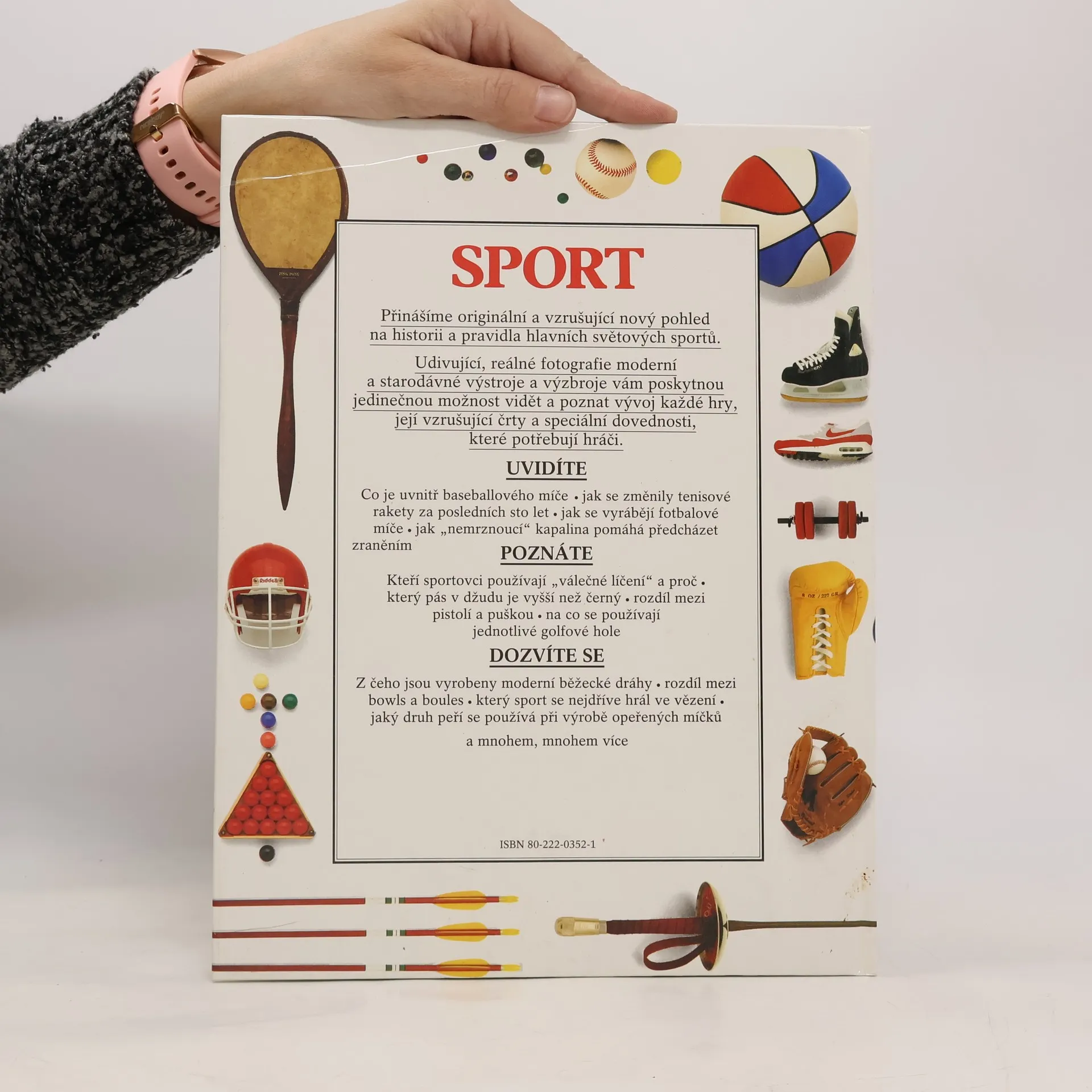 Originální a vzrušující nový pohled na historii a pravidla hlavních světových sportů. Udivující, reálné fotografie moderní a starodávné výstroje a výzbroje vám poskytnou jedinečnou možnost vidět a poznat vývoj každé hry, její vzrušující črty a speciální dovednosti, které potřebují hráči. UVIDÍTE co je uvnitř baseballového míče, jak se změnily tenisové rakety za posledních sto let, jak se vyrábějí fotbalové míče, jak "nemrznoucí " kapalina pomáhá předcházetzraněním. POZNÁTE, kteří sportovci používají "válečné líčení" a proč, který pás v džudu je vyšší než černý, rozdíl mezi pistolí a puškou, na co se používají jednotlivé golfové hole. DOZVÍTE SE z čeho jsou vyrobeny moderní běžecké dráhy, rozdíl mezi bowls a boules, kterýsport se nejdříve hrál ve vězení, jaký druh peří se používá při výrobě opeřených míčků a mnohem, mnohem více.... celý text