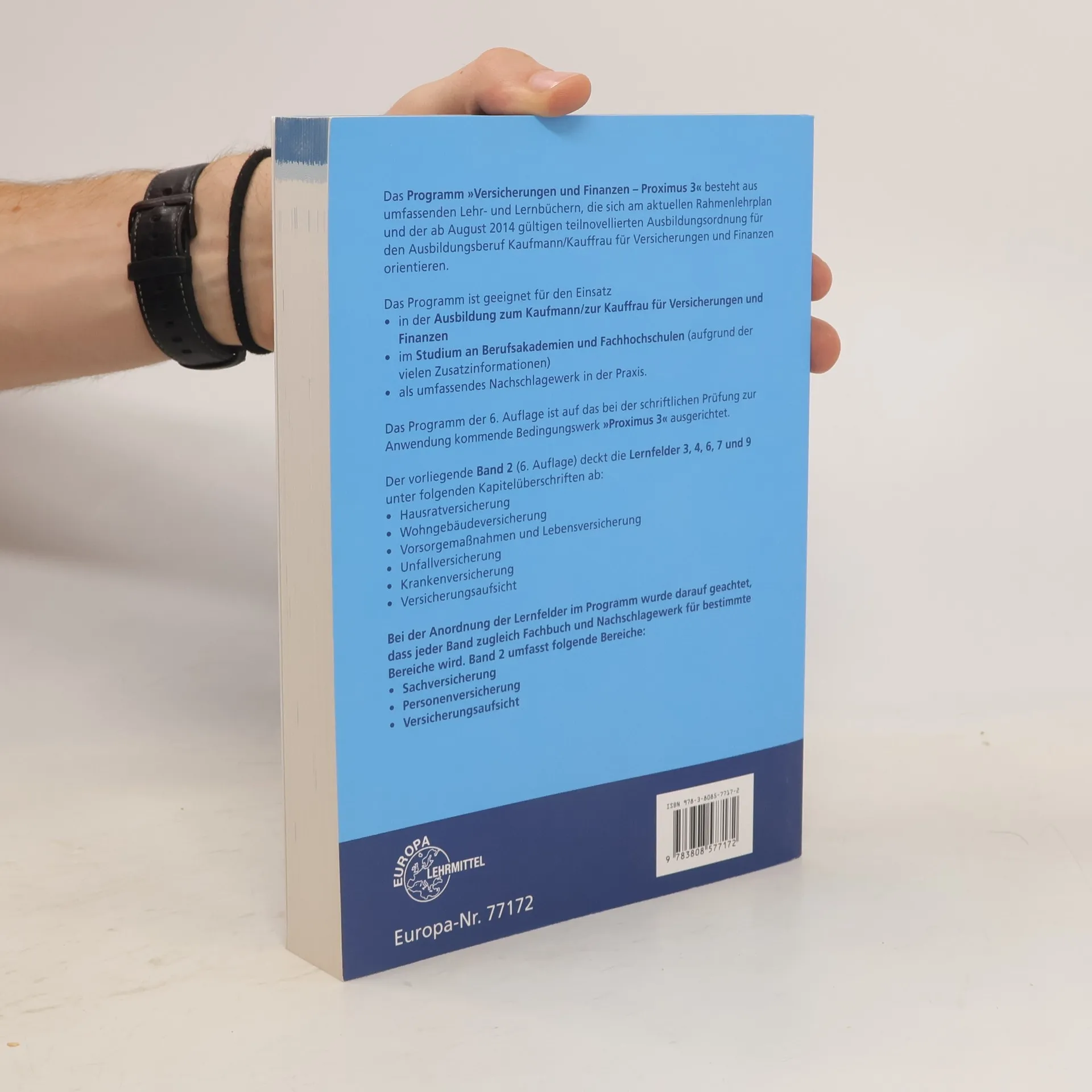 Dieser Band der Lehr- und Fachbuchreihe zur Ausbildung als Kaufmann/Kauffrau für Versicherungen und Finanzen umfasst die Themen Hausratversicherung, Wohngebäudeversicherung, Vorsorgemaßnahmen, Lebensversicherung, Unfallversicherung und Krankenversicherung. Seine Inhalte decken die Lernfelder 3 und 6 (1. Ausbildungsjahr) sowie 7 und 9 (2. Ausbildungsjahr) ab. Band 2 hat die Lernfelder zur Sach- und Personenversicherung zum Inhalt und stellt sich insofern auch als Fachbuch dar. Grundlage sind die Versicherungsbedingungen und Tarife nach dem neuen Bedingungswerk Proximus 3. Aufgrund der Teilnovellierung ist im Bereich der Lebensversicherung die Fondsgebundene Lebensversicherung eingeflossen. Im Bereich der Krankenversicherung sind die Umformulierungen (jetzt: Pflegepflichtversicherung, Pflegeergänzungsversicherung) berücksichtigt.