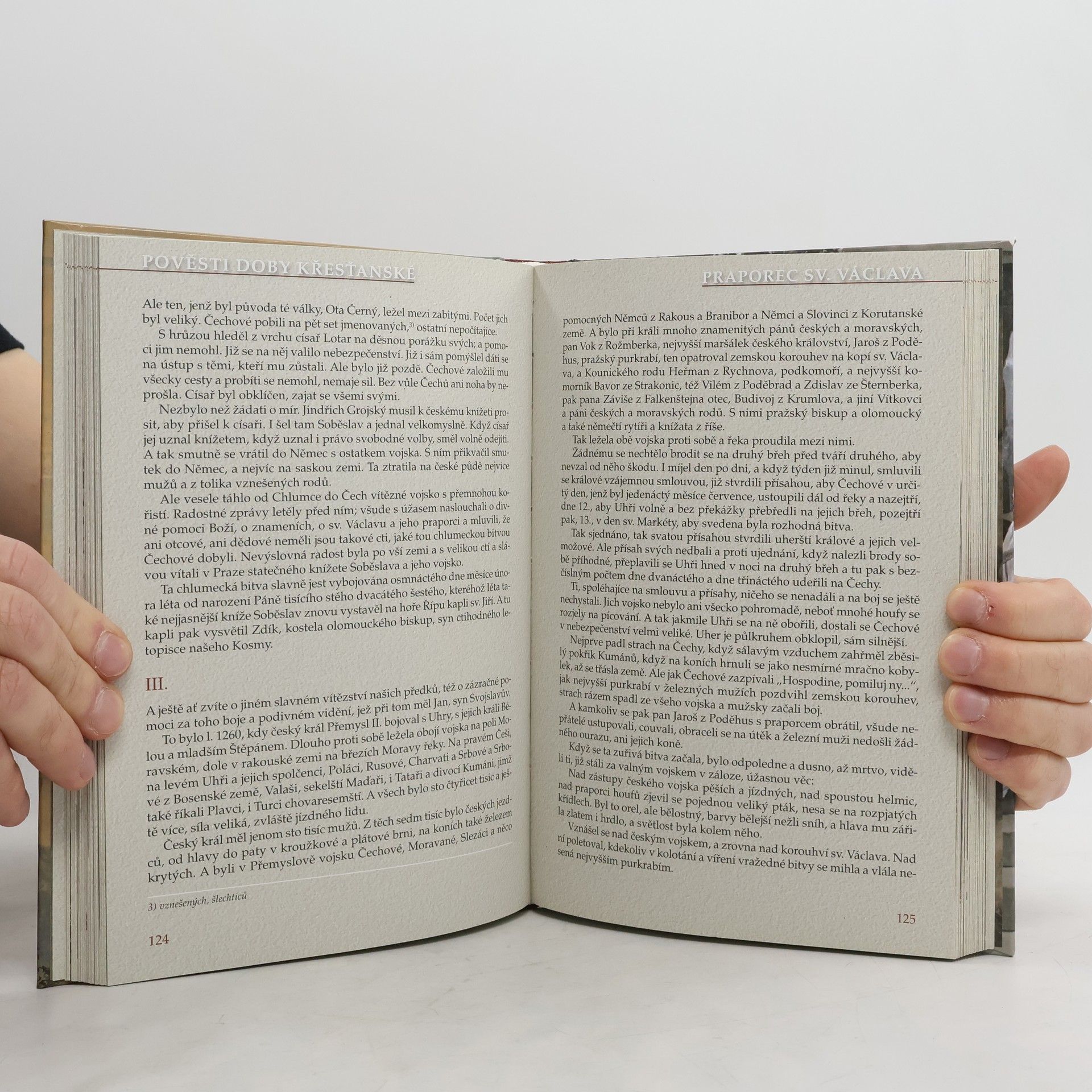 Poslyšte o našem praotci, o předcích, jak přišli do končin naší vlasti a usadili se po Labi a po Vltavě i po jiných řekách této země. Slyšte i, co více dochovalo se z temnoty věků, co zůstalo z báječných vypravování přešlých pokolení, jež klaněla se bohům v šeru starých hájů a jež obětovala studánkám v tichých ouvalech, jezerům i řekám i svatému, živému ohni ... Pojďte a poslyšte pověsti dávných časů...