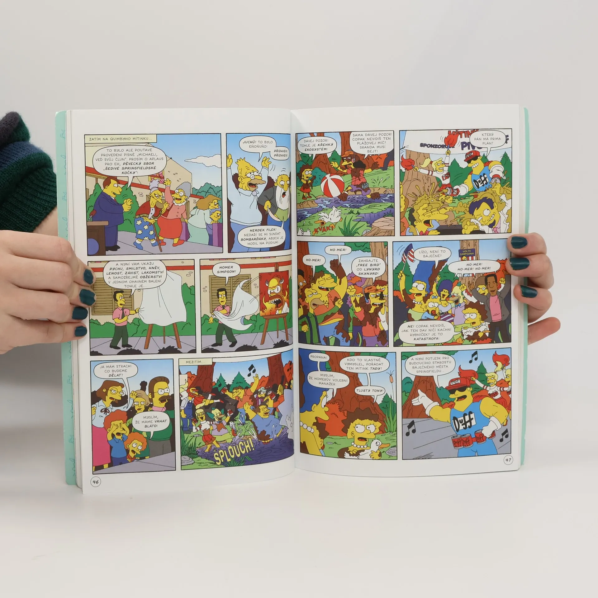 Hej, vítejte na pravé vesnické komiksové merendě! Připněte si pevně kšandy, nasaďte si holínky a rovnou do toho šlápněte! Homer se nám tu pustí do křížku se starostou Quimbym... když sám začne kandidovat! Bart se s kámoši rozhodne založit vlastní chlapeckou skupinu. Dívčí srdce budou v bezpečí – jejich ušní bubínky ne. Smithers začne obhospodařovat Homera a Bart se pustí do pravé bulvární novinařiny (jdi se zahrabat, Blesku). Takže neváhejte a přijďte si trsnout!