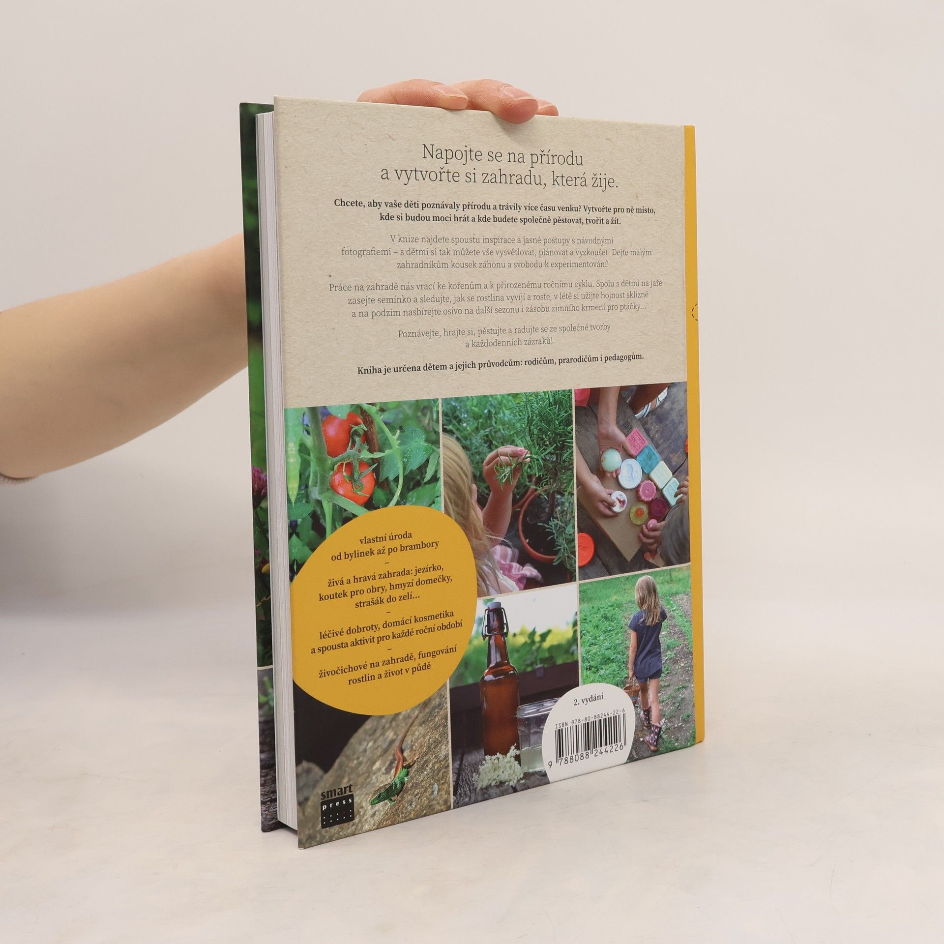 Kniha ukazuje, proč je zahrada úžasným místem k hraní a objevování s dětmi a rodinou. Obsahuje krásné fotografie z pestrého roku na zahradě, návodné postupy a ilustrace. Srozumitelně a zábavně vysvětluje principy úspěšného zahradničení, poskytuje kalendářní přehled pro celý rok a slouží jako praktický manuál pro jakoukoli zahradu. Zaměřuje se na zapojení dětí do dění, vtahuje je i jejich průvodce do pozorování přírodních krás a jevů. Nabízí inspiraci pro tvořivé a příjemné hraní v jakékoli sezóně, často spojené s opravdovým pěstováním, které baví dospělé i děti a umožňuje společně vypěstovat vlastní úrodu. Celoroční životní cyklus zahrady se prolíná s konkrétními aktivitami vhodnými pro děti formou originálních, ale snadno zvládnutelných projektů. Čtenář se dozví zajímavé detaily o životě zvířat a fungování rostlin, a seznámí se s tradičními rituály, které lze zapojit do moderního rodinného života. Autorka, zkušená v zahradničení a publikování, vysvětluje odborné souvislosti jasnou a poutavou formou a poskytuje praktické rady, jak zajistit, aby byla zahrada pro děti nejen podnětná, ale také bezpečná.