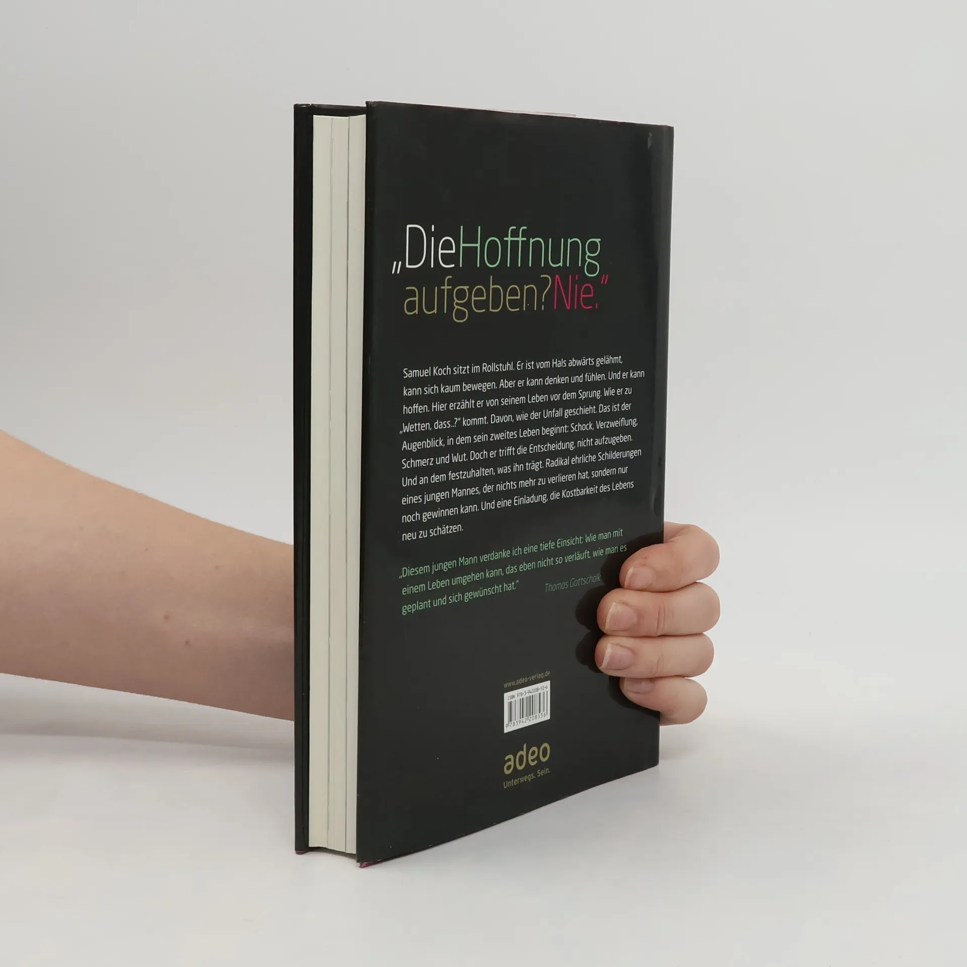 Samuel Koch sitzt im Rollstuhl. Er ist vom Hals abwärts gelähmt. Er kann noch nicht mal allein essen. Aber er kann denken und fühlen. Und er kann hoffen. Hier erzählt er von seinem Leben vor dem Sprung: wie er zu „Wetten dass ..?“ kommt. Davon, wie der Unfall geschieht. Das ist der Augenblick, in dem sein zweites Leben beginnt: Schock, Verzweiflung, Schmerz und Wut. Doch er trifft die Entscheidung, nicht aufzugeben. Und an dem Glauben festzuhalten, der ihn trägt. Radikal ehrliche Schilderungen eines jungen Mannes, der nichts mehr zu verlieren hat, sondern nur noch gewinnen kann. Und eine Einladung, die Kostbarkeit des Lebens neu zu schätzen. Mit einem Vorwort von Thomas Gottschalk und einem Nachwort von Michelle Hunziker.