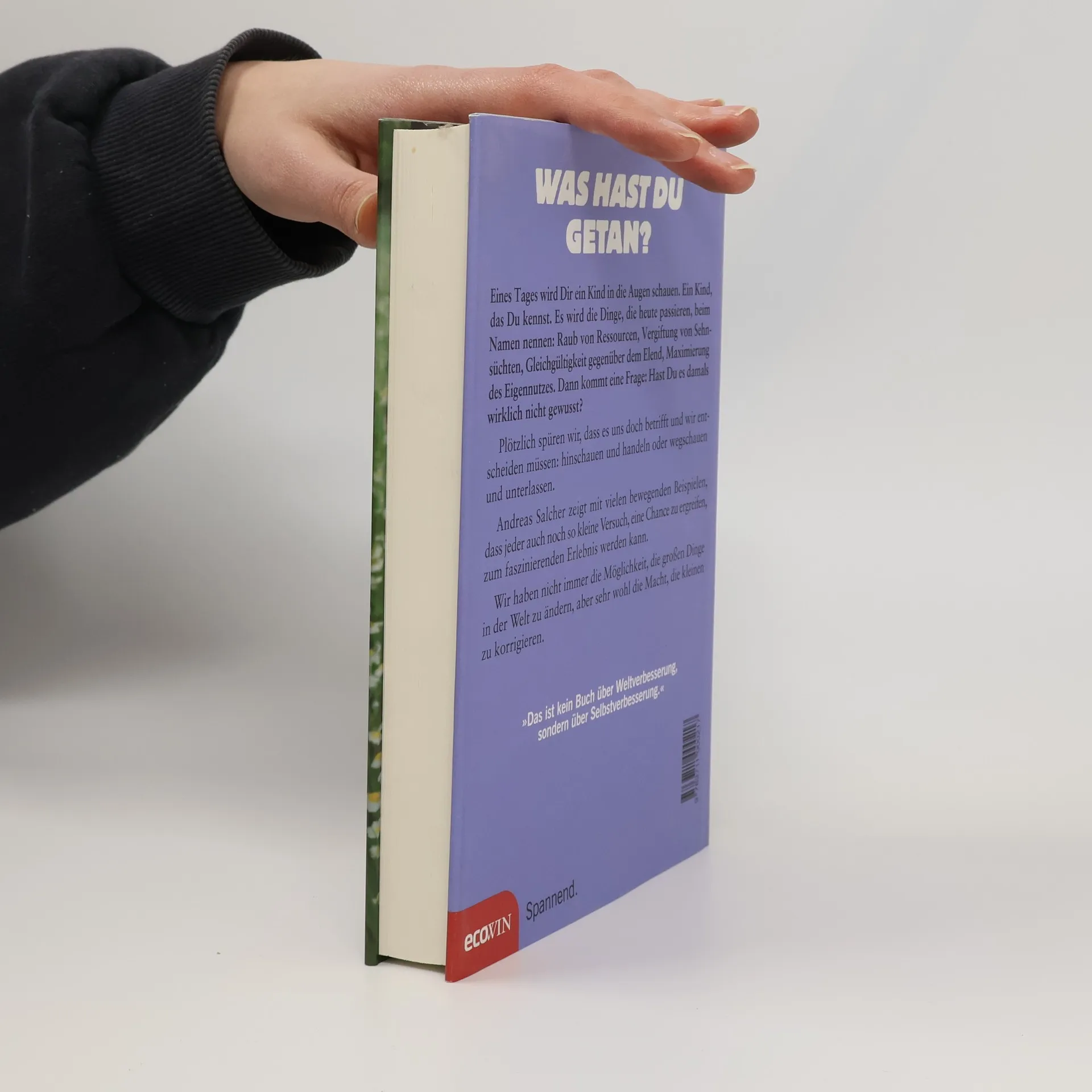 Was hast du getan? Eines Tages wird Dir ein Kind in die Augen schauen. Ein Kind, das Du kennst. Es wird die Dinge, die heute passieren, beim Namen nennen: Raub von Ressourcen, Vergiftung von Sehnsüchten, Gleichgültigkeit gegenüber dem Elend, Maximierung des Eigennutzes. Dann kommt eine Frage: Hast Du es damals wirklich nicht gewusst? Plötzlich spüren wir, dass es uns doch betrifft und wir entscheiden müssen: hinschauen und handeln oder wegschauen und unterlassen. Andreas Salcher zeigt mit vielen bewegenden Beispielen, dass jeder auch noch so kleine Versuch, eine Chance zu ergreifen, zum faszinierenden Erlebnis werden kann. Wir haben nicht immer die Möglichkeit, die großen Dinge in der Welt zu ändern, aber sehr wohl die Macht, die kleinen zu korrigieren. „Das ist kein Buch über Weltverbesserung, sondern über Selbstverbesserung.“