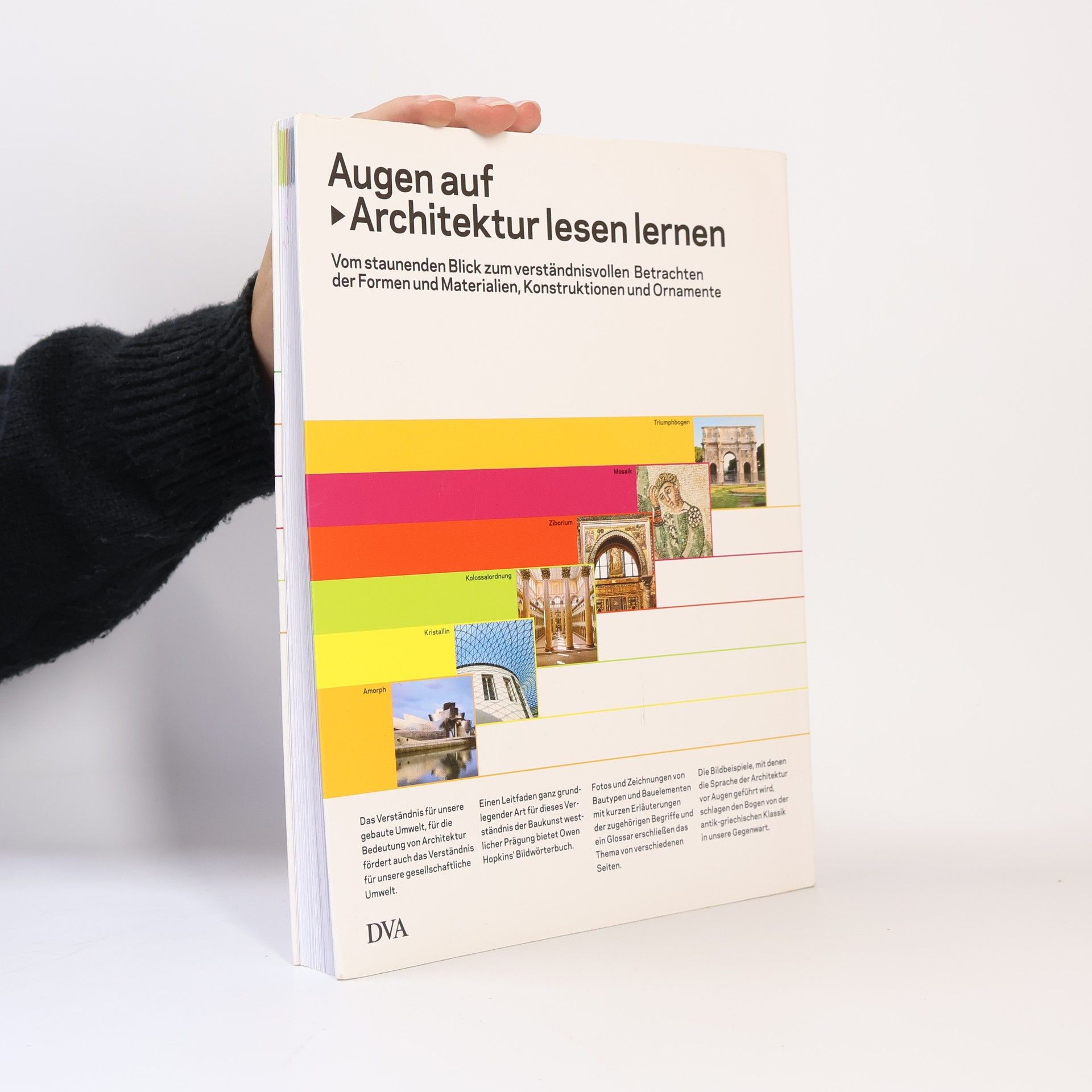 Was heißt wie in der Architektur? Einen einzigartigen Leitfaden ganz grundlegender Art für das Verständnis der Baukunst westlicher Prägung bietet Owen Hopkins’ Bildwörterbuch: Es geht vom Aussehen der Gebäude aus. Fotos und Zeichnungen von Bautypen, Baukonstruktionen und Bauelementen mit kurzen Erläuterungen der zugehörigen Begriffe und ein Glossar sind durch einheitliche Benennung und Querverweise eng vernetzt. Die Bildbeispiele schlagen den Bogen von der griechischen Antike bis in unsere Gegenwart. Klar, übersichtlich und gut verständlich bietet das Buch eine fundierte Einführung in die Architektur und dient als praktisches Nachschlagewerk. • Grundlegende Formen der Architektur – am Bauwerk gezeigt • Vom Sehen zum Benennen: Fotos und Zeichnungen als Ausgangspunkte • Vom Benennen zum Deuten: Hinweise auf Zusammenhänge Ausstattung: Mit 524 Abbildungen