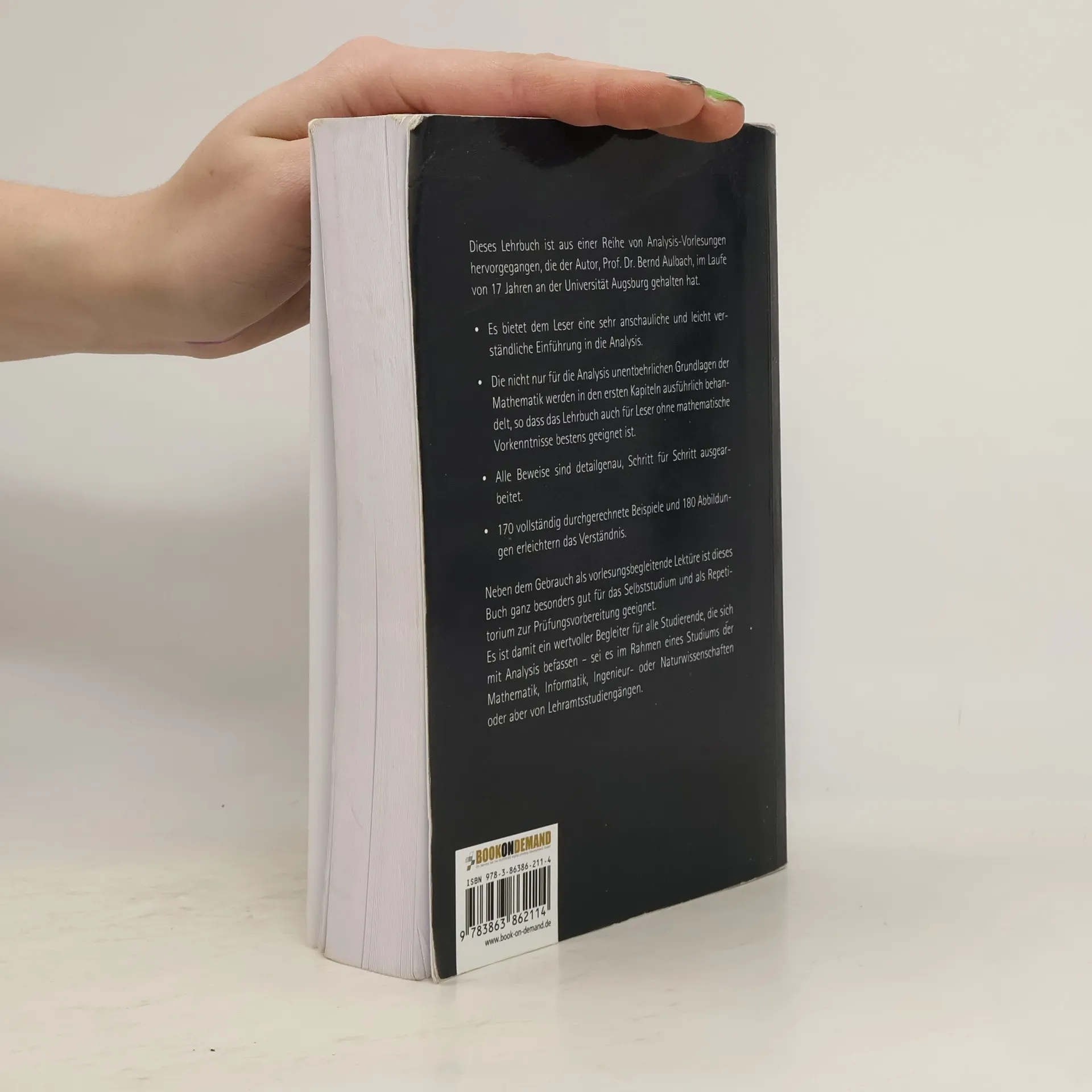 Dieses Buch richtet sich an Studierende der Mathematik, Informatik, Ingenieur- und Naturwissenschaften sowie an Lehramtsstudierende, die sich mit Analysis befassen. Es eignet sich hervorragend als vorlesungsbegleitende Lektüre, für das Selbststudium und zur Prüfungsvorbereitung. Ziel ist es, eine anschauliche und leicht verständliche Einführung in die Analysis zu bieten, ohne dass umfangreiche mathematische Vorkenntnisse erforderlich sind, abgesehen von grundlegenden Begriffen der Schulmathematik. Die ersten Kapitel widmen sich den notwendigen mathematischen Grundlagen, gefolgt von anschaulich und verständlich präsentierten Inhalten der Analysis I und II. Definitionen, Lehrsätze und Beweise werden anhand von Beispielen und Abbildungen erklärt, um das Verständnis zu fördern. Rund 170 vollständig durchgerechnete Beispiele festigen nicht nur den Lehrstoff, sondern führen auch in weitere Grundkonzepte der Mathematik ein. Zudem unterstützen 180 Abbildungen die Veranschaulichung wichtiger Inhalte. Besonders die komplexeren Beweise werden detailliert und schrittweise erläutert. Dieses Lehrbuch basiert auf einer Reihe von Vorlesungen, die der Autor, Prof. Dr. Bernd Aulbach, über 17 Jahre an der Universität Augsburg gehalten hat, und wurde optimiert, um den Studierenden eine möglichst verständliche Vermittlung des Lehrstoffes zu bieten.