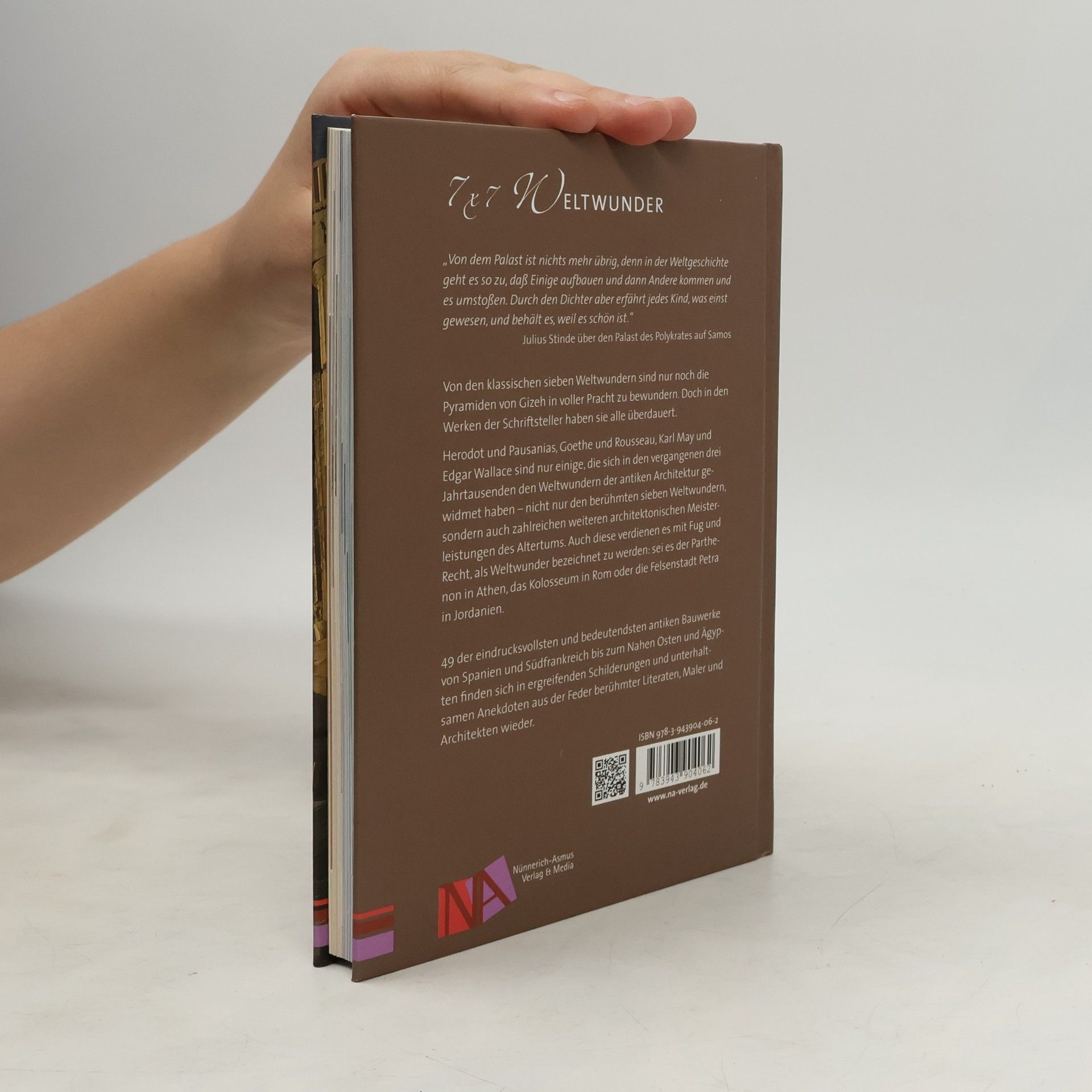 Und es gibt sie doch. Mehr als sieben Weltwunder! Allen bekannt und wenig erhalten haben sie in zahlreichen literarischen Betrachtungen überlebt. Schriftsteller von Herodot und Pausanias über Goethe bis Karl May und Edgar Wallace haben sich über drei Jahrtausende der Beschreibung der Weltwunder antiker Architektur gewidmet. Von den klassischen sieben Weltwundern sind heute allein noch die Pyramiden von Gizeh in ihrer ganzen Pracht zu bewundern. Doch zahlreiche andere architektonische Meisterleistungen verdienen mit Fug und Recht als Weltwunder bezeichnen zu werden: Der Parthenon in Athen, das Kolosseum in Rom oder die Felsenstadt Petra in Jordanien seien beispielhaft herausgegriffen. Dieser handliche Band bereist 49 der eindrucksvollsten und bedeutendsten antiken Bauwerke von Spanien und Südfrankreich bis zum Nahen Osten und Ägypten. Ergreifende Schilderungen und unterhaltsame Anekdoten berühmter Literaten werden um übersichtliche Erläuterungen bereichert. So entsteht ein faszinierendes Bild von dem, was uns die Antike vorgestern und gestern erzählte und heute sowie auch morgen noch erzählen wird. Jubiläumsausgabe - 10 Jahre Nünnerich-Asmus Verlag