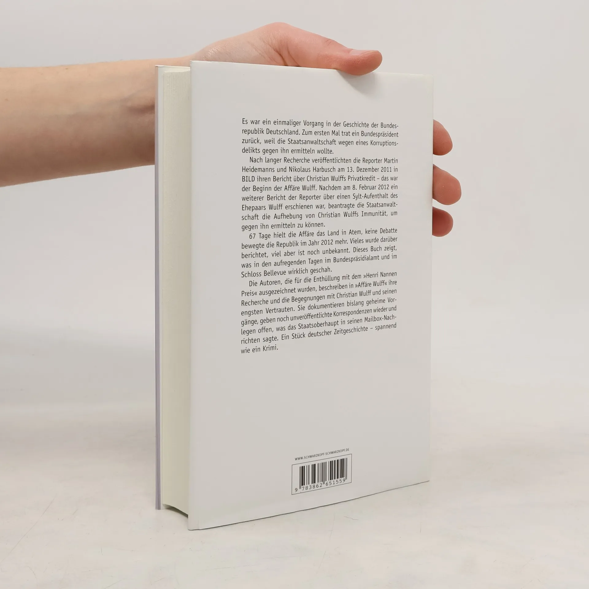 Die Journalisten Martin Heidemanns und Nikolaus Harbusch sind den Verwicklungen des ehemaligen Bundespräsidenten auf den Grund gegangen. Nach mehr als zweijähriger Recherche deckten sie am 13. Dezember 2011 die Kredit-Affäre auf. Sie stießen auf weitere Fälle, in denen Wulff in seiner Vergangenheit als niedersächsischer Ministerpräsident Beziehungen zu reichen Unternehmern für seinen privaten Vorteil genutzt haben soll. Das Buch »Affäre Wulff« beleuchtet den Skandal von allen Seiten: Die Autoren erzählen die ganze Geschichte um die Aufdeckung der Affäre, liefern Rechercheprotokolle, geben Einblicke in die Praxis des investigativen Journalismus und machen bisher unveröffentlichte Dokumente zugänglich. Das Buch ist eine informative und spannende Dokumentation, die die Enthüllung des Skandals Schritt für Schritt nachvollzieht und tiefe Einblicke in die Recherchearbeit von Journalisten gewährt.