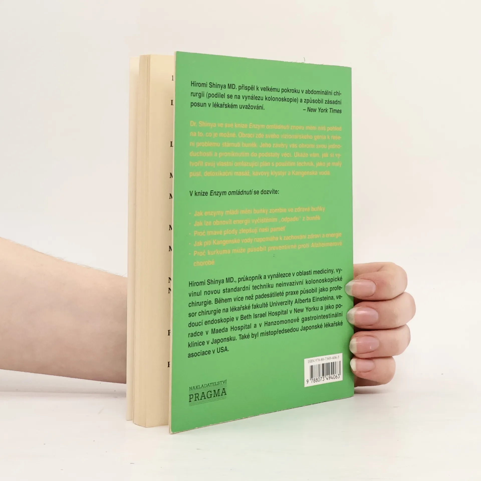 Světově uznávaný gastroenterolog Hiromi Shinya, proslulý objevem kolonoskopie, představuje svou další knihu Enzym omládnutí, která se ve světě stala bestsellerem. Svými knihami se snaží vést lidi ke změně jídelníčku, který podle jeho slov může za vážná onemocnění jako Alzheimerova choroba nebo rakovina. Ukazuje, že zlepšením přijímané stravy a zavedením jednoduchých půldenních půstů můžeme podpořit regenerační a omlazující schopnost našich buněk. Kniha je snadným návodem, jak můžeme sami zlepšit nejen fyzické, ale také psychické zdraví.