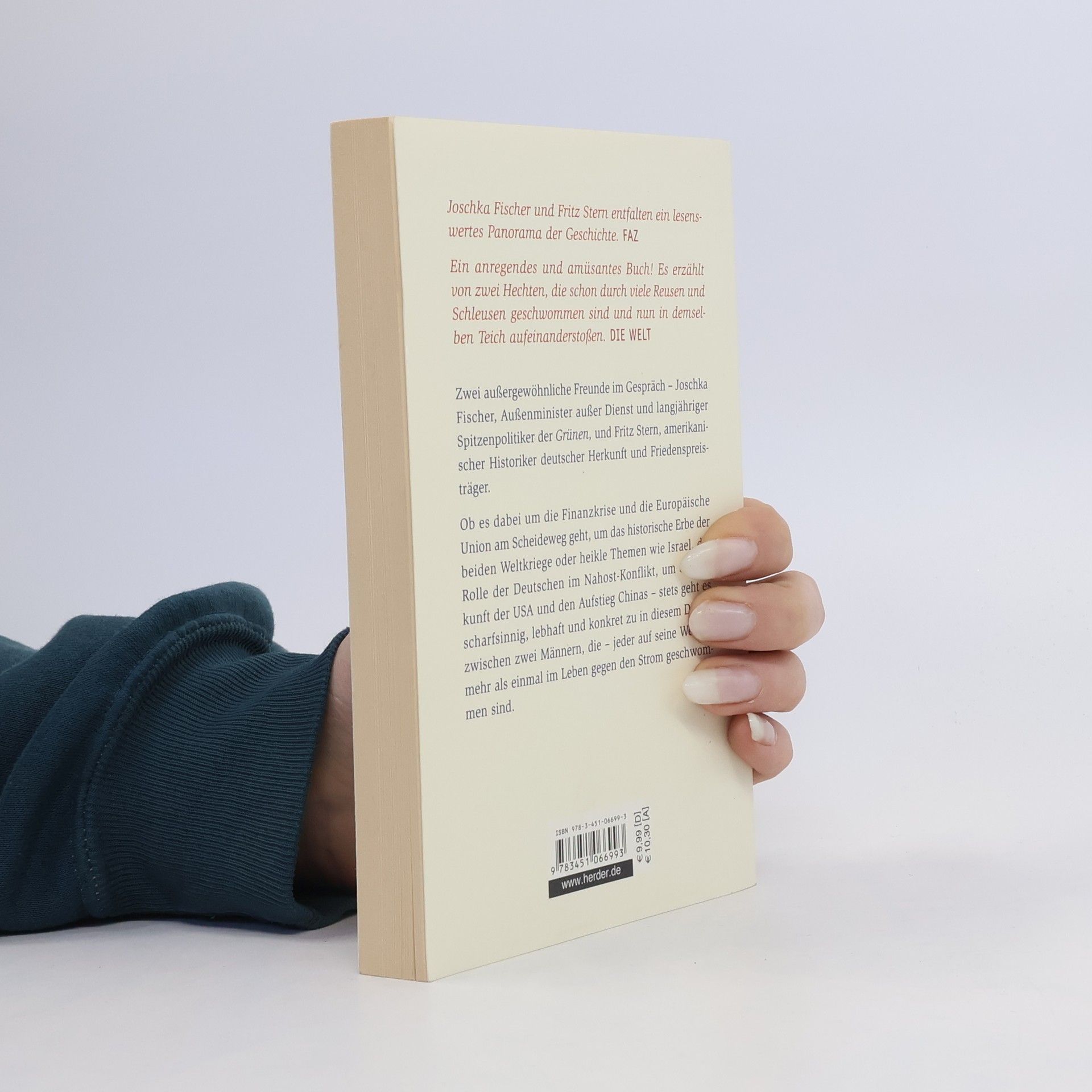 Fritz Stern und Joschka Fischer sprechen über Themen, die sie beschäftigen und bewegen - neugierig aufeinander und immer daran interessiert, die eigenen Erfahrungen und Positionen zu hinterfragen. Sie sprechen über Heimatgefühle, Kindheitserinnerungen, über das historische Erbe der Weltkriege und diskutieren aktuelle politische Fragen - in Europa, den USA und im Nahen Osten. Mit weitreichender Kenntnis und rhetorischer Brillianz geht es dabei zu, nicht selten auch mit lakonischem Witz und Pointen, vor allem aber mit der Kraft der Argumente. Stets geht es scharfsinnig, lebhaft und konkret zu in diesem Dialog zwischen zwei Männen, die jeder auf seine Weise mehr als einmal im Leben gegen den Strom geschwommen sind.