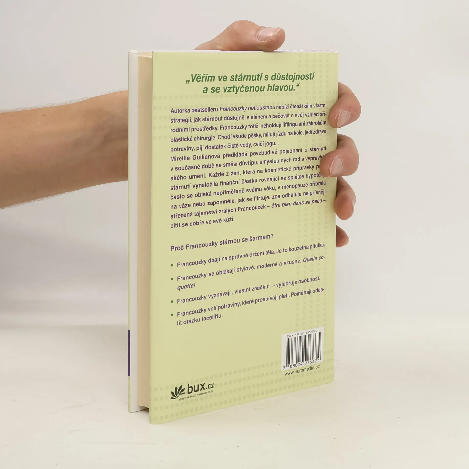 Tajemství, jak neztratit šarm. Autorka patří mezi ty Francouzky, které jsou údajně nejšťastnější ve zralém věku. Už nemusí hledat práci, nedychtí po kariéře, mají stálé přátele, zavedenou domácnost a umí přijímat libůstky i omezení. Dozvíte se tajemství péče o vzhled, jaké sportovní aktivity jsou nejvhodnější, jaký význam má spánek a snídaně pro zralé ženy. Autorka poodhalí vlastní formuli, která zlepší váš život, vzhled a zdraví, bude vám přinášet spokojenost a pomůže vám cítit se dobře ve své kůži v každém věku.