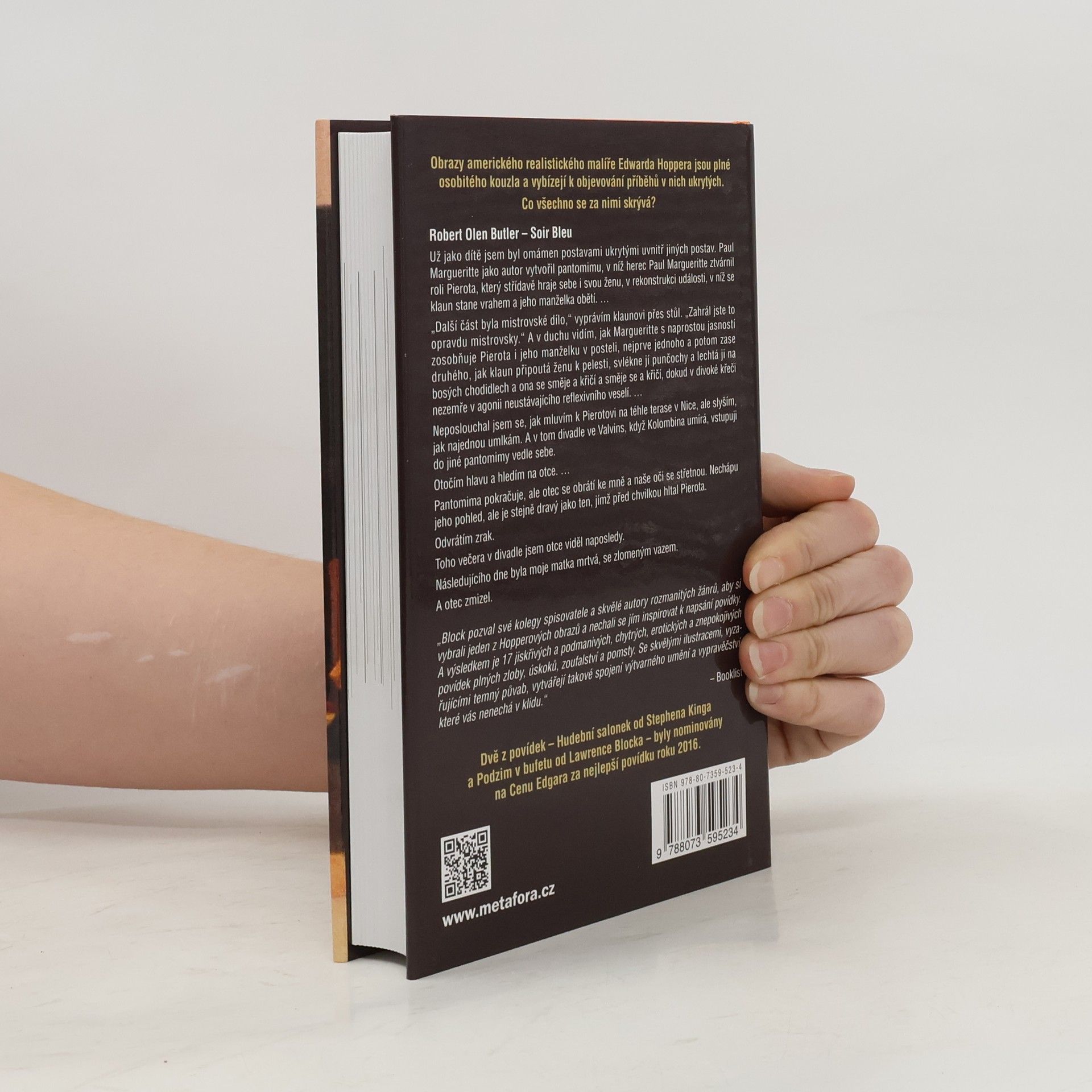 Patnáct světoznámých prozaiků se nechalo inspirovat dílem Edwarda Hoppera a na jeho motivy napsali každý svůj originální příběh. Další připojila Gail Levinová, kunsthistorička a známá odbornice na Hopperovo dílo. Poslední přidal Lawrence Block, autor více než padesáti bestsellerů, který rovněž povídky sestavil do této antologie. Každá ze sedmnácti povídek je uvedena barevnou reprodukcí obrazu, z něhož spisovatel čerpal. Vyprávění se ujali mistři pera a autoři bestsellerů z různých žánrů. Nechybějí ani takoví velikáni, jakými jsou Stephen King, Lee Child či Joyce Carol Oatesová. K nim se přidala i řada dalších, například Michael Connelly, Megan Abbottová, Justin Scott (nazývaný „Dickem Francisem jachtingu“) či mistr detektivního thrilleru Jeffery Deaver. Můžete se těšit na širokou škálu žánrů, od hororu, přes detektivku až po povídky tajemné, fantastické či romantické. Obrazy amerického realistického malíře Edwarda Hoppera jsou plné osobitého kouzla a nejen milovníky umění vybízejí k objevování příběhů v nich ukrytých. Díváme se na ně a jsme vtahováni do jejich světa. Co všechno se za nimi skrývá?