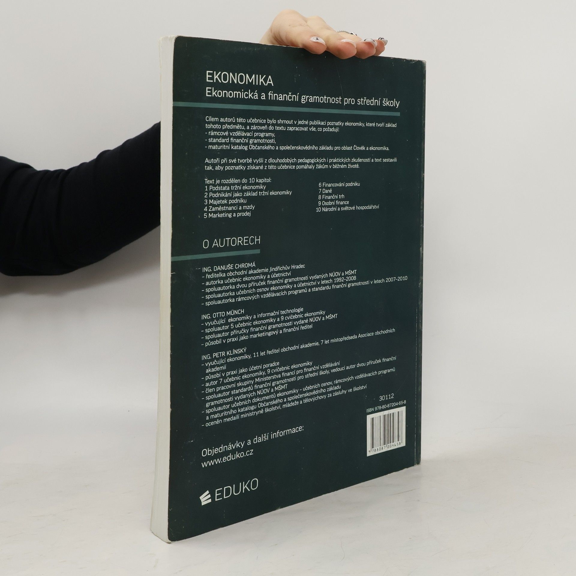 Učebnice shrnuje vše, co požaduje RVP, standard finanční gramotnosti a maturitní katalog Občanského základu v jedné publikaci. Je určena pro střední školy, které nemají ekonomické zaměření - tedy odborné školy a gymnázia. Autoři učebnice jsou také spoluautoři aktuálních vzdělávacích dokumentů, což zaručuje jejich vzájemný soulad. Učebnice je rozdělena do 10 kapitol (1 Podstata tržní ekonomiky, 2 Podnikání jako základ tržní ekonomiky, 3 Majetek podniku, 4 Zaměstnanci a mzdy, 5 Marketing a prodej, 6 Financování podniku, 7 Daně, 8 Finanční trh, 9 Osobní finance, 10 Národní a světové hospodářství ) Publikace je zároveň cvičebnicí (za každou kapitolou jsou zařazeny otázky a úkoly).