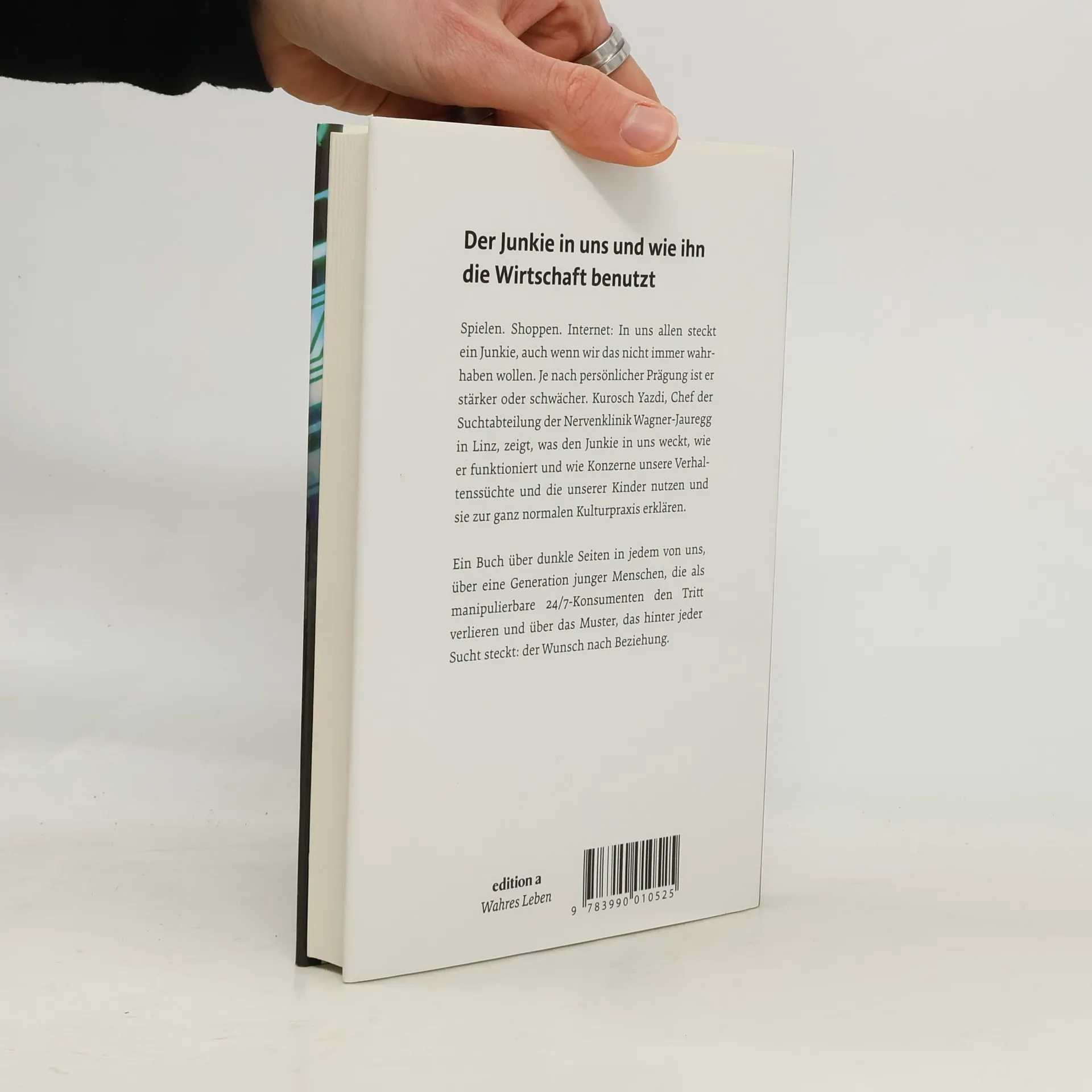 Spielen. Shoppen. Internet: In uns allen steckt ein Junkie, auch wenn wir das nicht immer wahrhaben wollen. Je nach persönlicher Prägung ist er stärker oder schwächer. Kurosch Yazdi, Chef der Suchtabteilung der Nervenklinik Wagner-Jauregg in Linz, zeigt, was den Junkie in uns weckt, wie er funktioniert und wie Konzerne unsere Verhaltenssüchte und die unserer Kinder nutzen und sie zur ganz normalen Kulturpraxis erklären. Ein Buch über dunkle Seiten in jedem von uns, über eine Generation junger Menschen, die als manipulierbare 24/7-Konsumenten den Tritt verlieren und über das Muster, das hinter jeder Sucht steckt: der Wunsch nach Beziehung.