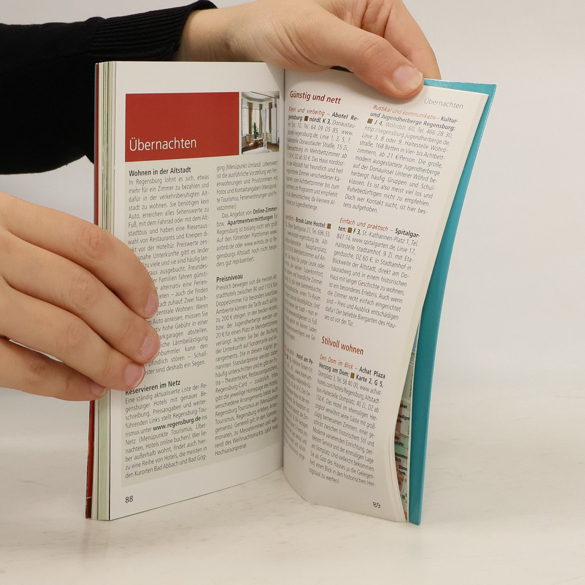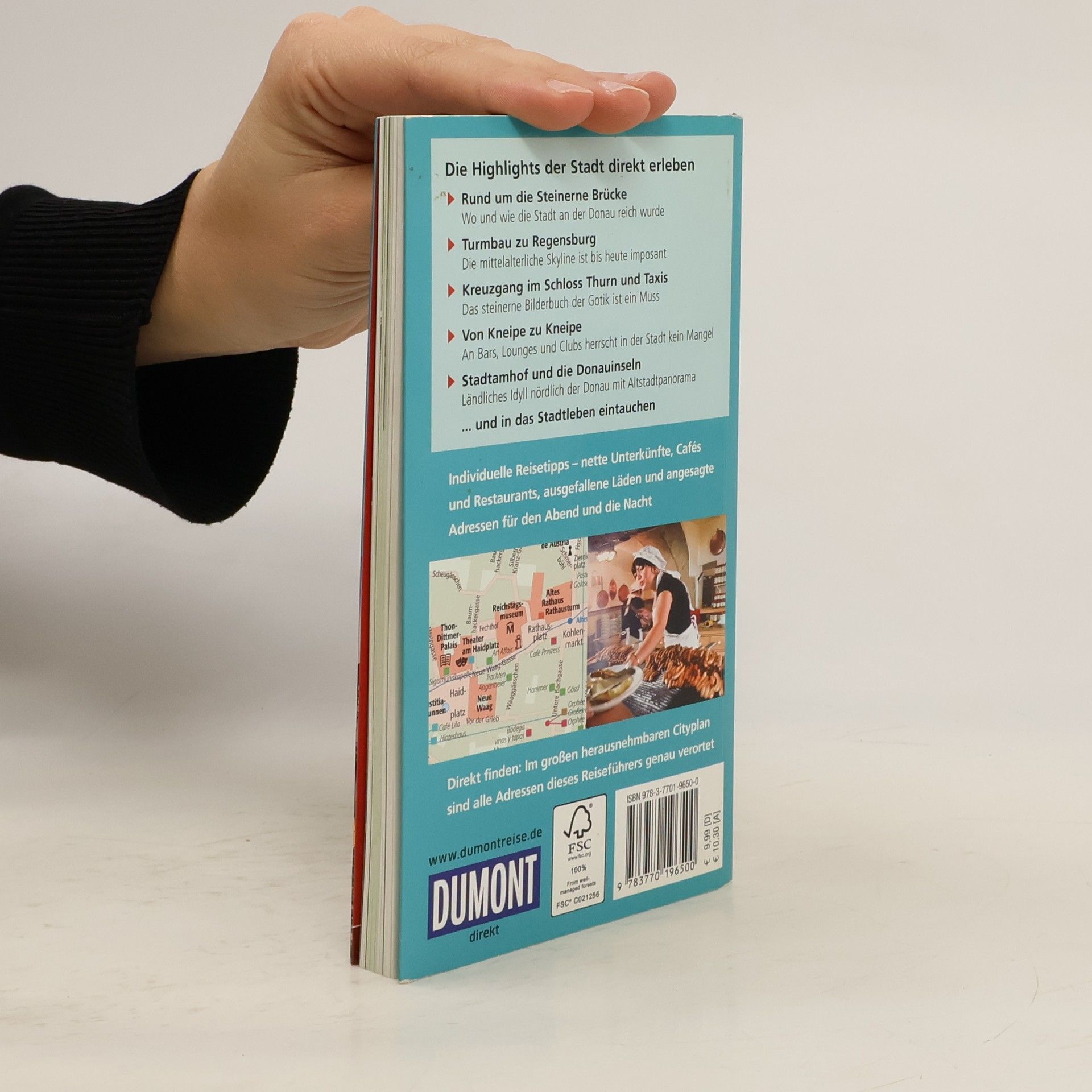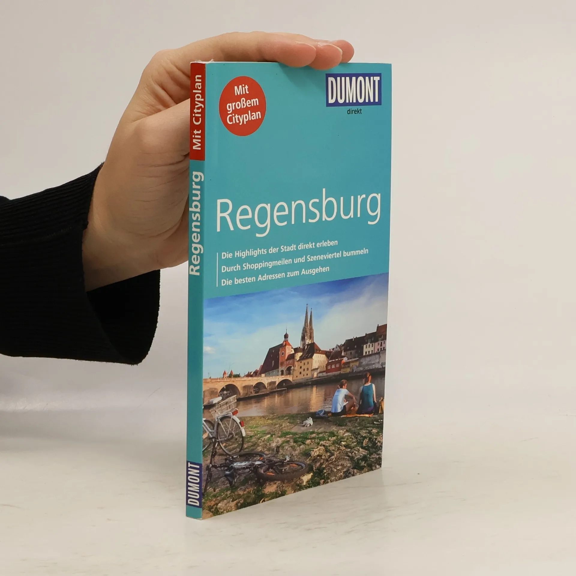 Acht Stockwerke stehen zwischen der Gesandtenstraße und dem schönsten Panorama von Regensburg. Dies umfasst das Goldene Kreuz, die Neupfarrkirche, der Löblturm, St. Emmeram und natürlich der Dom St. Peter! In 15 »Direkt-Kapiteln« führt die Autorin Daniela Schetar die Besucher direkt zu den Highlights der Stadt und hilft, ihr Wesen zu entdecken, ihren Puls zu spüren: an der Steinernen Brücke; der Dombau zu Regensburg; rund um den Bischofshof; im Historischen Museum; Jüdisches Regensburg am Neupfarrplatz; Handwerk mit Tradition; rund um Altes und Neues Rathaus; vom Turmbau zu Regensburg; Sanierung und Denkmalschutz; Regensburg macht die Nacht zum Tag; Abtei St. Emmeram; Schloss Thurn und Taxis; Kunstforum Ostdeutsche Galerie; einmal um die Altstadt; Stadtamhof und die Donauinseln. Rund 200 handverlesene Adressen für jede Laune, jeden Geschmack, jeden Geldbeutel, von der Übernachtung über Essen und Trinken sowie Einkaufen bis Ausgehen lassen den Citytrip zum Erlebnis werden. Jede Adresse ist mit einem Schlagwort versehen – das erleichtert die schnelle Orientierung. Im großen separaten Cityplan sind alle im Buch empfohlenen Adressen namentlich eingetragen, außerdem zeigt er einen Liniennetzplan, eine Extrakarte zur Altstadt, sowie eine Umgebungskarte. Die Übersichtskarte zeigt alle Highlights, Detailpläne erlauben die präzise Orientierung in den 15 »Direkt-Kapiteln«.