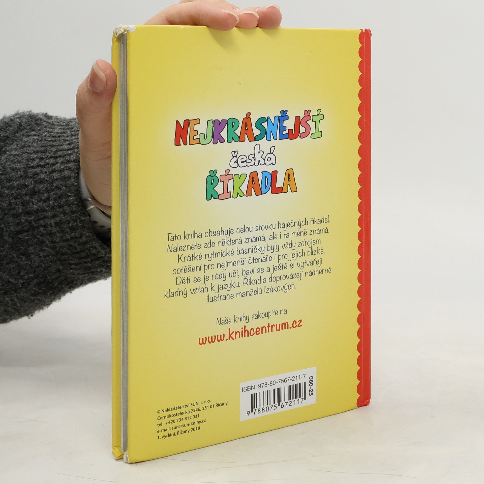 V této krásné sbírce naleznete přesně sto krásných českých říkadel, mezi nimi je například Zlatá brána otevřená, Šnečku, šnečku vystrč růžky, Běží liška k Táboru, Vařila myšička kašičku, Rak leze z díry, Žába skáče po blátě, Ententýky dva špalíky a mnohá další obecně známá. Krátké rytmické básničky byly vždy zdrojem potěšení pro nejmenší čtenáře i pro jejich blízké. Říkadla si můžete prohlížet se svými dětmi, učit se je a prohlížet si pestré obrázky od manželů Izákových.
