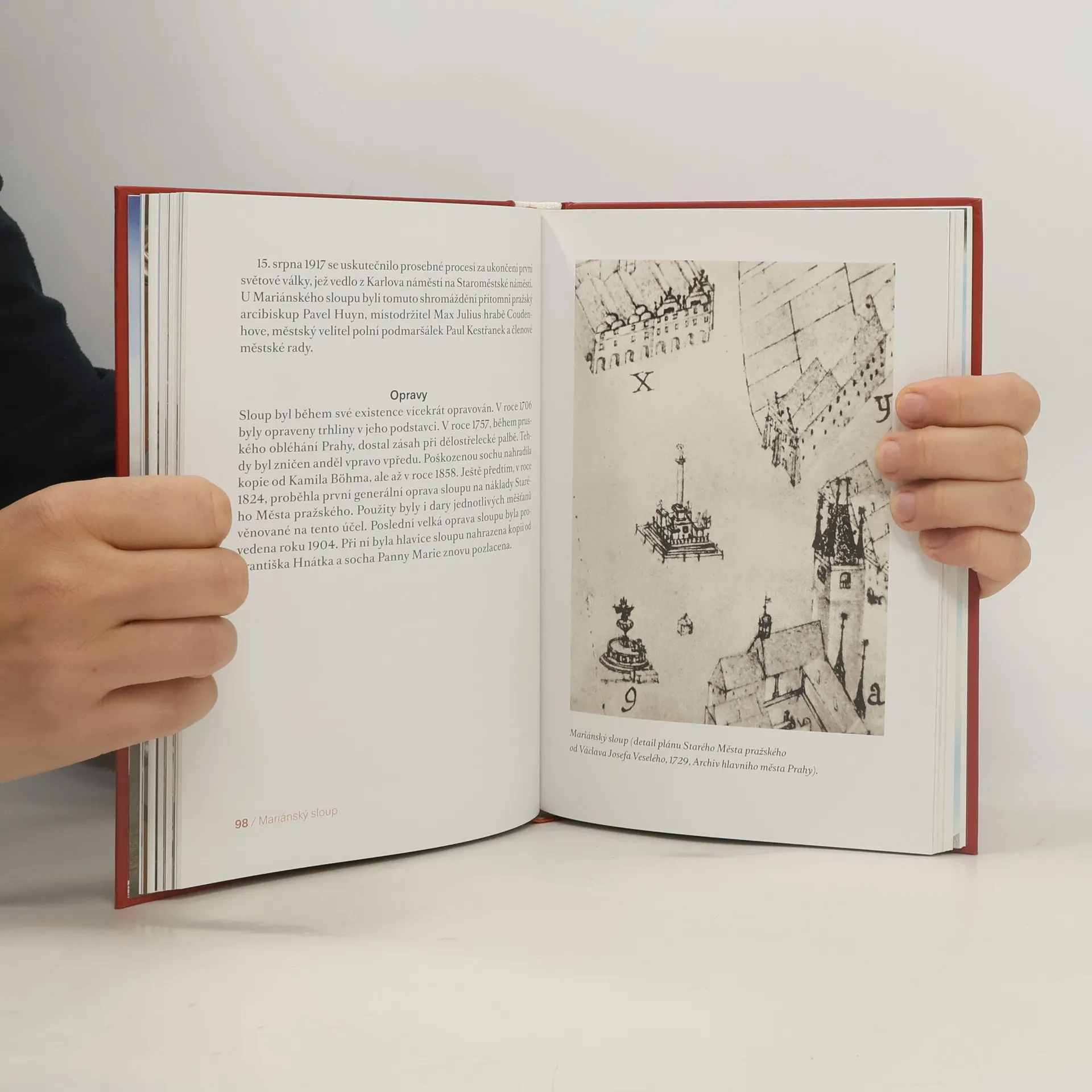 Kniha přístupnou a atraktivní formou pojednává o vzniku, stržení i obnově mariánského sloupu na Staroměstském náměstí v Praze. Sloup byl postaven jako pomník k poctě Bohorodičky – na poděkování za obranu Prahy před pleněním švédských vojsk v roce 1648. Místo, kde stál a opět stojí, lze bez obav označit za duchovní střed Prahy i Evropy. Dílo českého raněbarokního sochaře Jana Jiřího Bendla považují mnozí po zásluze za umělecky hodnotnější, než jsou podobné sloupy ve Vídni a v Mnichově. Autor nezastírá, že sloup je předmětem ostrých historických, politických a konfesních sporů, volá ovšem po vzájemném porozumění a usmíření. Když se sloup v listopadu 1918 stal terčem politováníhodného vandalského činu, nikdo netušil, že se jeho obnovy dočkáme až v létě 2020. Stržení sloupu se ale mezitím stalo mohutným impulsem pro výstavbu řady nových kostelů na různých místech Prahy (viz epilog knihy). Autor uvádí do pozoruhodných souvislostí stavby, události i osobnosti, spjaté s Mariánským sloupem. Jeho výklad doprovázejí desítky fotografií, ukázky z dobových dokumentů, reprodukce výtvarných děl, ale i modlitby, dopisy, básně a věroučné reflexe.