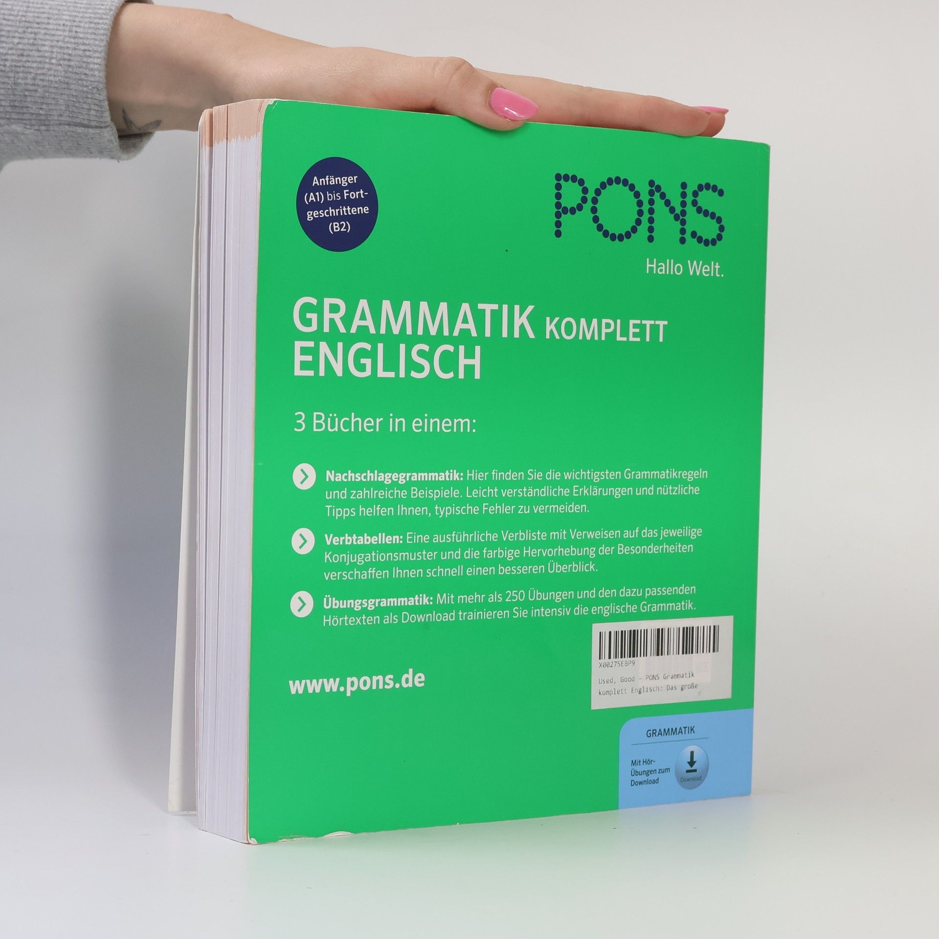 Das große Übungs- und Nachschlagebuch 3 Bücher in einem: - Nachschlagegrammatik: Hier finden Sie die wichtigsten Grammatikregeln und zahlreiche Beispiele. Leicht verständliche Erklärungen und nützliche Tipps helfen Ihnen, typische Fehler zu vermeiden. - Verbtabellen: Eine ausführliche Verbliste mit Verweisen auf das jeweilige Konjugationsmuster und die farbige Hervorhebung der Besonderheiten verschaffen Ihnen schnell einen besseren Überblick. - Übungsgrammatik: Mit mehr als 250 Übungen und den dazu passenden Hörtexten als Download trainieren Sie intensiv die englische Grammatik. Für Anfänger (A1) bis Fortgeschrittene (B2) die Grammatik-Profis werden wollen.