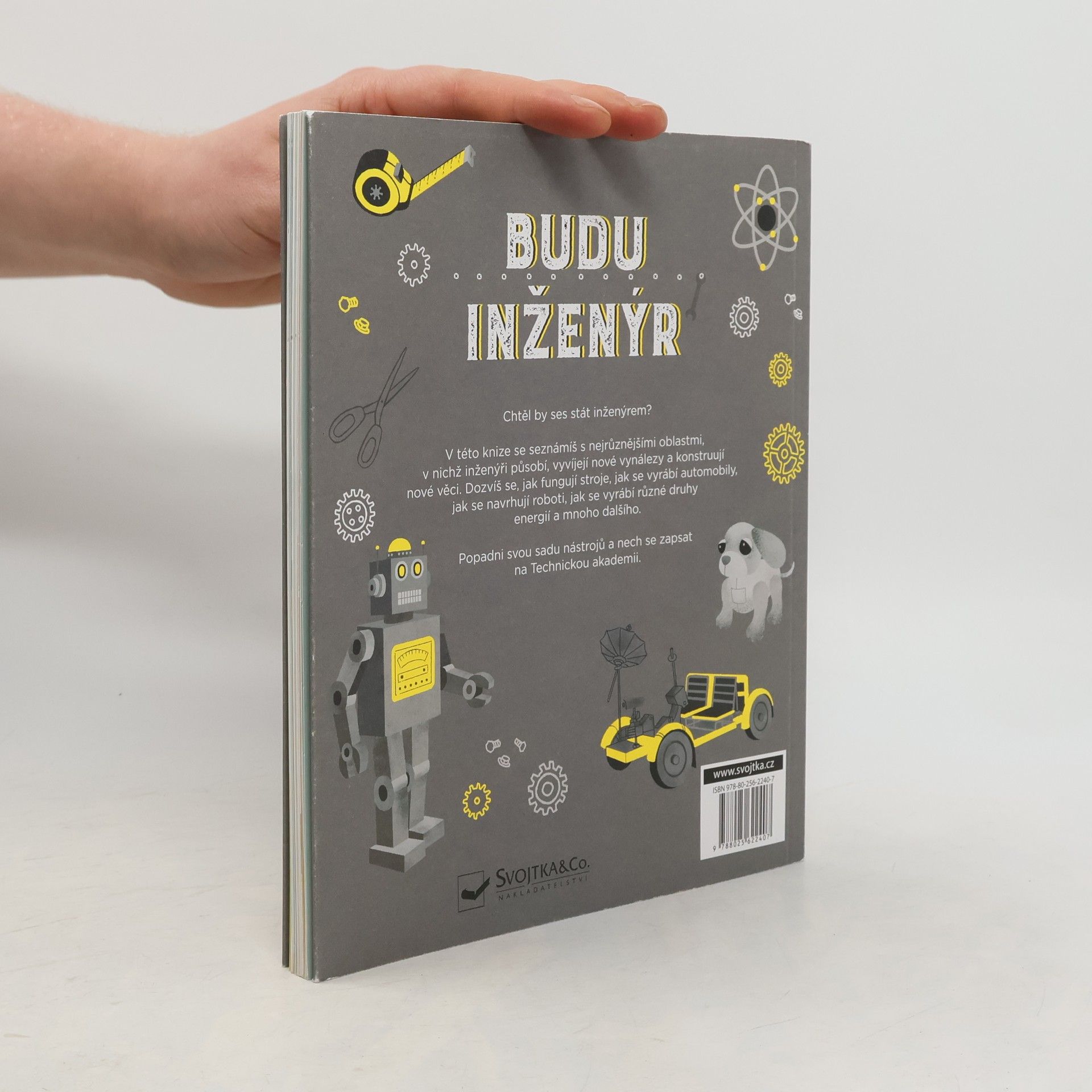 Zajímáš se o nejrůznější stroje? Chceš vědět, jak fungují? Baví tě vymýšlet a konstruovat třeba roboty? Pokud je tvá odpověď ano, přihlas se na Technickou akademii v této knize a objev nejrůznější odvětví inženýrství. Knížka je nabitá informacemi o slavných vynálezcích a jejich strojích. Počteš si o zajímavostech z mnoha technických odvětví od strojírenství a leteckého inženýrství přes robotiku až po energetiku a materiálové inženýrství. Dozvíš se spoustu věcí o tom, jak jednotlivé stroje fungují a k čemu jsou dobré. Víš, čím se liší materiály? Zjistíš také, proč je dobré vyrábět elektřinu alternativní postupy. Vyzkoušíš si, jak funguje páka nebo kladka, sestavíš proudový motor, jaký mají letadla, a postavíš vlastní větrnou elektrárnu. Pusť se do aktivit, hlavolamů, her a za každý splněný úkol si nalep samolepku. Nakonec si zahraj s kamarády deskovou hru Závod po ranveji. Do jakého oboru se pustíš nejdřív? Svět techniky a inženýrství už na tebe čeká. Brožovaná s klopnami; obsahuje samolepky, plakát, vylamovací model.