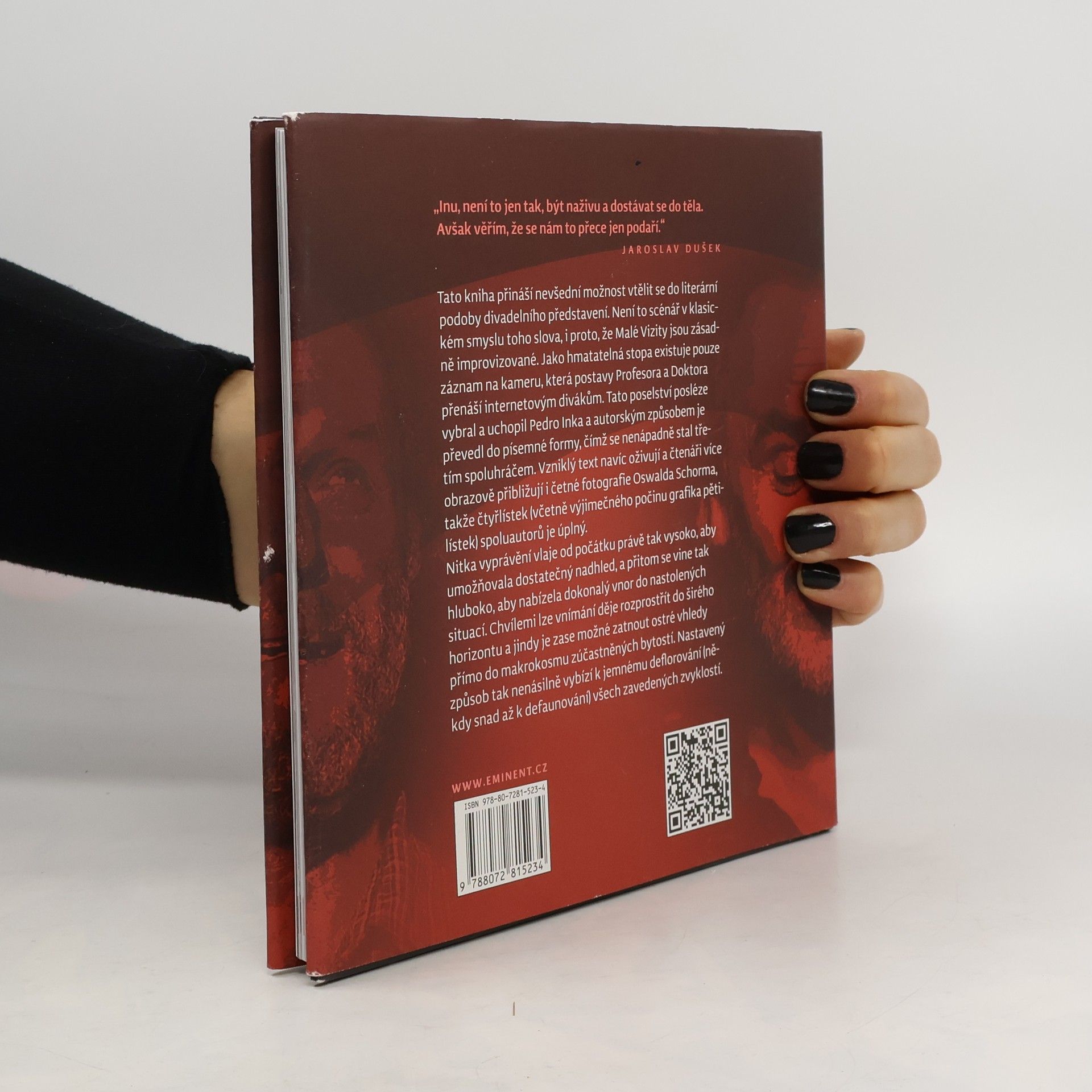 Opakování je matka moudrosti Tato kniha přináší nevšední možnost vtělit se do literární podoby divadelního představení. Není to scénář v klasickém smyslu toho slova, i proto, že Malé Vizity jsou zásadně improvizované. Jako hmatatelná stopa existuje pouze záznam na kameru, která postavy Profesora a Doktora přenáší internetovým divákům. Tato poselství posléze vybral a uchopil Pedro Inka a autorským způsobem je převedl do písemné formy, čímž se nenápadně stal třetím spoluhráčem. Vzniklý text navíc oživují a čtenáři více obrazově přibližují i četné fotografie Oswalda Schorma, takže čtyřlístek (včetně výjimečného počinu grafika pětilístek) spoluautorů je úplný. Nitka vyprávění vlaje od počátku právě tak vysoko, aby umožňovala dostatečný nadhled, a přitom se vine tak hluboko, aby nabízela dokonalý vnor do nastolených situací. Chvílemi lze vnímání děje rozprostřít do širého horizontu a jindy je zase možné zatnout ostré vhledy přímo do makrokosmu zúčastněných bytostí. Nastavený způsob tak nenásilně vybízí k jemnému deflorování (někdy snad až k defaunování) všech zavedených zvyklostí.
